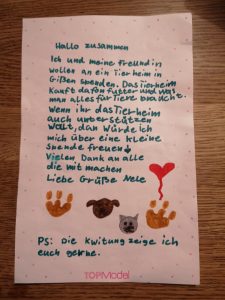 Die tierliebe, neunjährige Nele wollte für unsere Tiere etwas Gutes tun und sammelte im Freundeskreis stolze 420 Euro. Das Geld wird für die Renovierung des Kleintierhauses verwendet. Herzlichen Dank liebe Nele!!