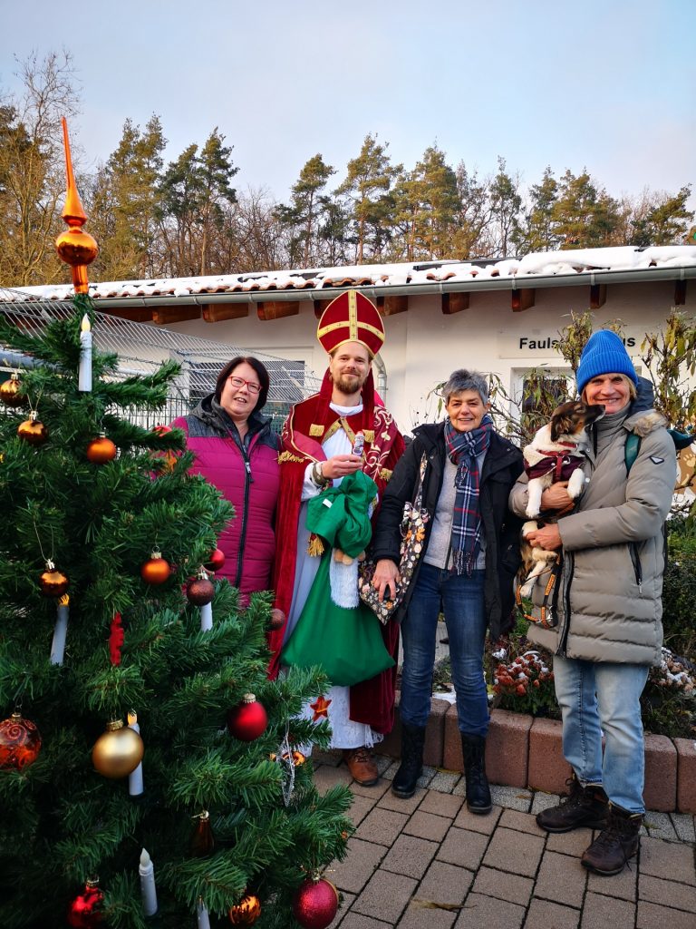 Entstanden ist die Idee bei einem Hundespaziergang. Leberwurstkekse sind, zumindest bei den Hunden in Reiskirchen-Ettingshausen, sehr beliebt. Dass Tiere nicht ohne Einfluss auf ihre Menschen sind, zeigt das Ergebnis der Aktion: Im Rahmen des Lichterfestes des Tierheims Gießen konnten Heidi und Heike 241,43 € an die Vorsitzende des Tierheims übergeben. Astrid Paparone und der Nikolaus freuten und bedankten sich bei Heike Feldmann-Murken(li) und Heidi Riedel-Ciesla(2.v.re) für die schöne Aktion