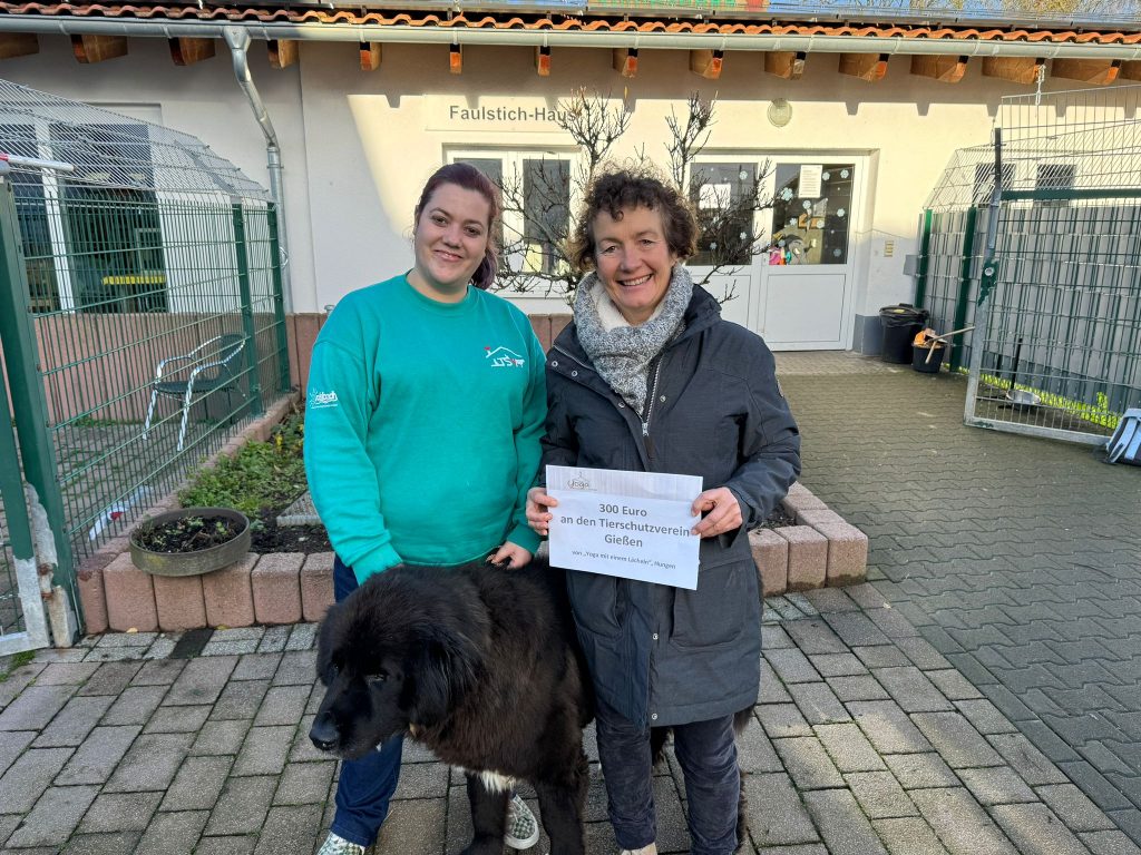 In guter Tradition haben die Yogaschülerinnen und -schüler des Yogastudios „Yoga mit einem Lächeln“ aus Hungen in der letzten Woche vor Weihnachten Gelder für einen guten Zweck gesammelt. 300 Euro sind dabei für den Tierschutzverein Gießen zusammengekommen, die von Martina Beele-Peters als Inhaberin des kleinen Yogastudios nun persönlich an Hannah Wern übergeben werden konnten. Die Tierheimleitung freute und bedankte sich sehr dafür, dass das Yogastudio das Tierheim zum wiederholten Male mit einer Spende bedenkt. Bei dem Besuch und der Führung durch das Tierheim konnte Martina Beele-Peters sich einen guten Eindruck von der Arbeit des Tierheims machen und ist sich sicher, dass das gesammelte Geld hier sehr gut eingesetzt wird. Mit viel Engagement werden die Tiere hier versorgt und umsorgt.