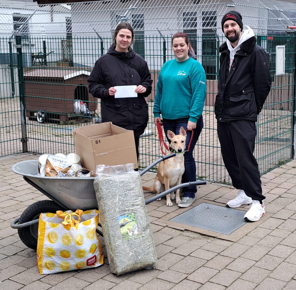 In diesem Jahr durften wir uns nun über Geld- und Sachspenden der zwei freuen! Auf dem Foto seht ihr die beiden zusammen mit unserer Tierheimleitung Hannah Wern und Hündin Bella bei der Übergabe der Spende.