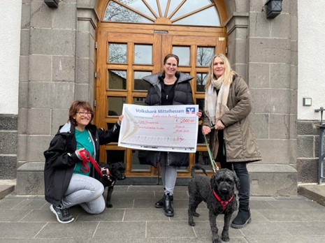 Die Schriftführerin des TSV Gießen und Umgebung e.V.Gabi Stasch war in der großen Pause mit den beiden Hunden Rapunzel und Stitch persönlich gekommen, um die Spende entgegenzunehmen. Die Hunde waren kürzlich aus einer Animal-Hoarding-Pension befreit worden. Was die Tiere durchgemacht hatten, konnte man nun nur noch erahnen. Schüler/innen und Lehrer/innen waren jedoch gleichermaßen gerührt von dem Anblick.