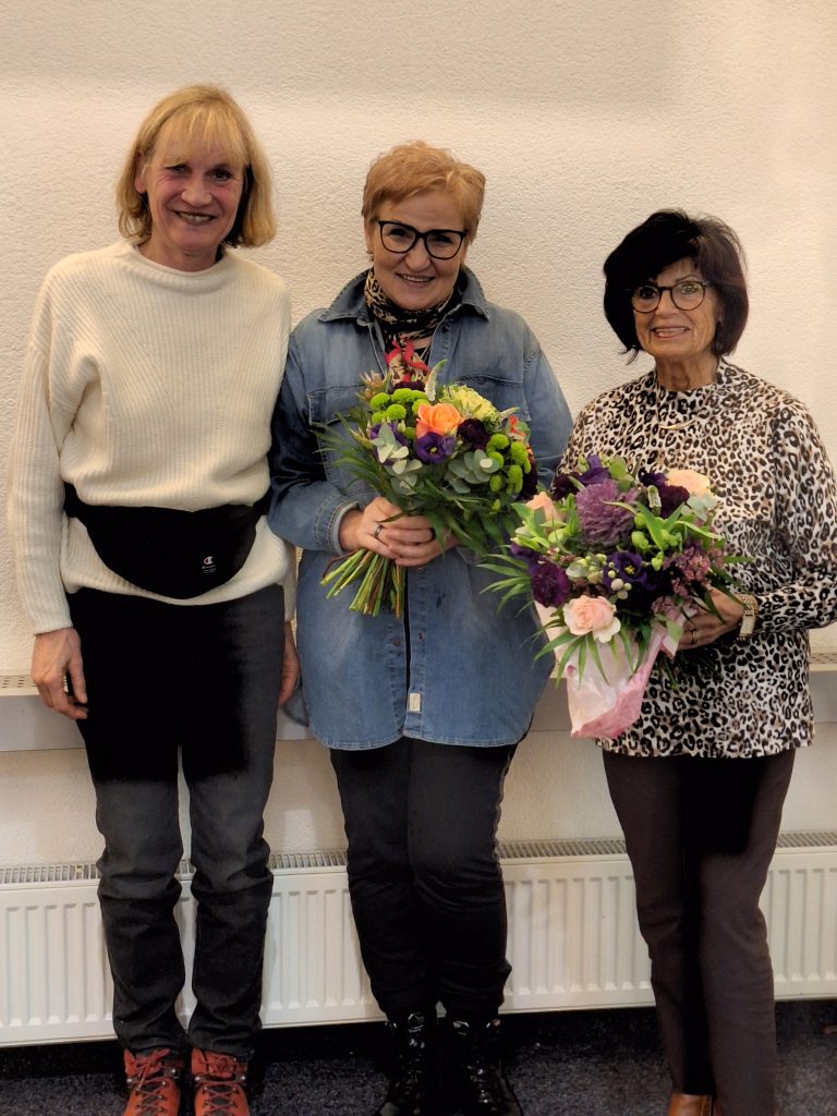 Ein großes Dankeschön geht an Kassenwartin Martha Novak (mi), die aus persönlichen Gründen das Amt leider nicht weiterführen konnte. Als Kassenwartin wurde Daniela Kutscher mit einer Enthaltung gewählt, Gabi Stasch übernahm ,ebenfalls mit eine Enthaltung , die Position der Schriftführerin. Beide sind schon seit mehreren Jahren ehrenamtlich im Verein tätig. Als Kassenprüfer wurden Volker Wollenhaupt und Eckard Volkmann gewählt. Astrid Paparone freute sich sehr darüber, Waltraud Sattler (re)für ihre 50ig jährige Mitgliedschaft beglückwünschen zu können.