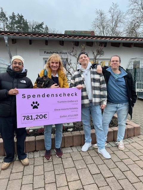 Das Gießener Veranstaltungskollektiv “Disco Volante” hat dem örtlichen Tierheim eine Spende in Höhe von 781,20 Euro übergeben. Das Geld stammt aus einem von der Gruppe organisierten Flohmarkt, bei dem neben klassischen Secondhand-Ständen auch eine Kunstaktion unter dem Motto „Kunst gegen Spende“ sowie selbstgebackener Kuchen für zusätzliche Einnahmen sorgten.