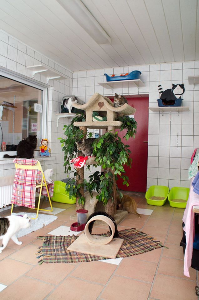 Freiwillige gibt es auch bei den Samtpfoten. Katzenstreichler und Vermittlungshelfer sorgen für Wohlbefinden und gute Beratung. Selbst in der notwendigen Quarantänestation müssen die Neuankömmlinge und Kranken nicht in engen Boxen sitzen, sondern dürfen kleine Zimmer mit angeschlossenen Außenvolieren ihr Eigen nennen. Auf der in sich geschlossenen Infektionsstation können sich auch schwer kranke Tiere auskurieren. Das Katzenhaus wurde jüngst durch die Pfleger im Innen- sowie Ehrenamtler im Außenbereich komplett neu gestaltet. Für jede Katze gibt es jeden Tag etwas Neues zu erklimmen oder zu entdecken. Genügend Rückzugsorte und ein spezielles Zimmer für ängstliche Zeitgenossen sind natürlich auch vorhanden. Um gegen eventuell aufkommende Langeweile vorzugehen, gibt es das Trockenfutter nicht einfach aus dem Napf. Dem passionierten Jäger Katze werden verschiedene Möglichkeiten an ganz vielen unterschiedlichen Stellen geboten, sich seine nächste Mahlzeit selbst zu erarbeiten. Aber für auch sensible Individualisten ist immer ein Plätzchen in einem Einzelzimmer oder sogar in der Futterküche frei.