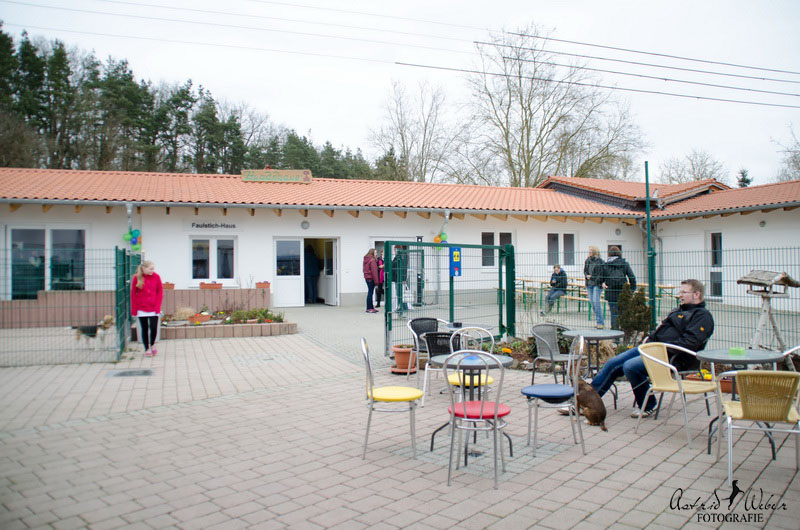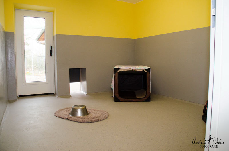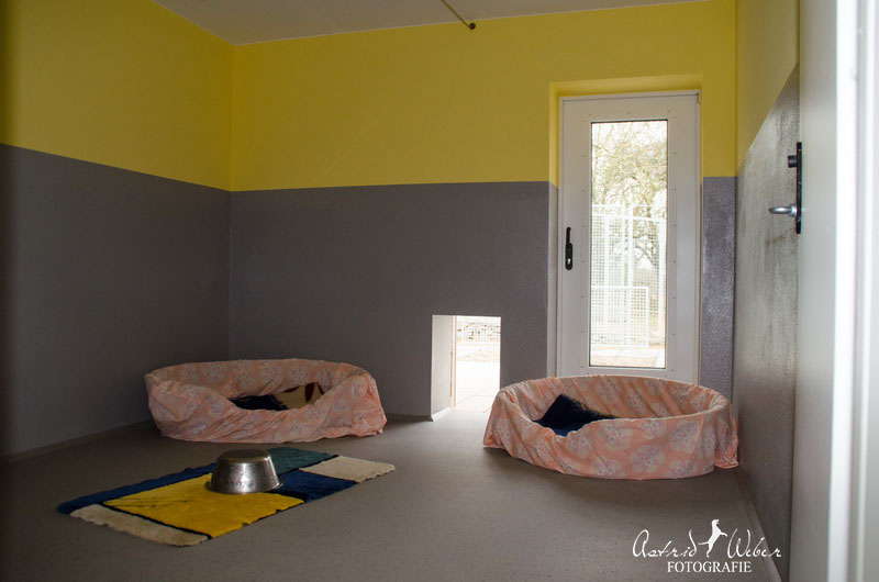 Vom alten Hundehaus mit seiner maroden Zwingeranlage ist heute nur noch das Hinweisschild auf dem Dachfirst übriggeblieben. Die kalte und laute Atmosphäre ist warmen und gemütlichen Zimmern inklusive kleinem „Garten“ von mindestens 14m2 gewichen. Die Hunde leben – sofern verträglich – mindestens paarweise oder sogar in kleineren Rudeln zusammen. Sie bekommen alle täglich die Möglichkeit, in gut strukturierten und hundegerechten Ausläufen den Wechsel der Jahreszeiten hautnah mitzuverfolgen. Gegen Langeweile und Frust bemühen sich täglich viele fleißige ehrenamtliche Helfer, die mit ihnen spazieren gehen oder für vorbildhaftes Verhalten im neuen Zuhause trainieren.