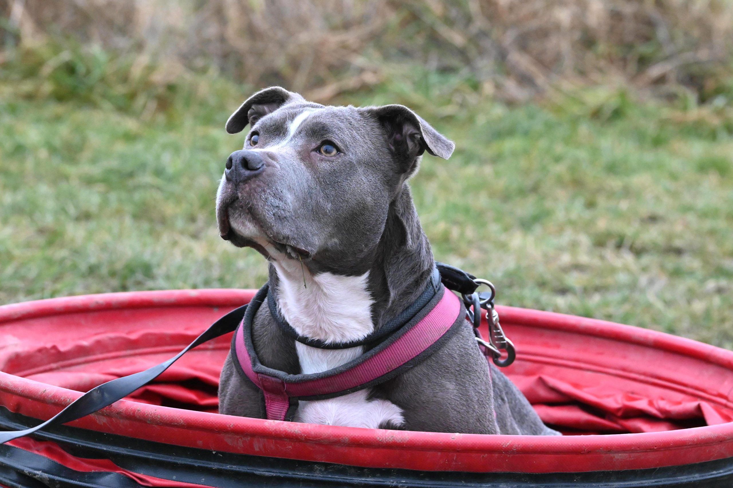 Die hübsche Staffordshire Hündin Luna hat bei uns im Tierheim schon große Fortschritte gemacht. Luna kam ins Tierheim, nachdem klar wurde, dass sie den Wesenstest nicht besteht. Luna reagierte sowohl auf fremde Menschen und als auch auf Hunde. Es wurde schnell klar, dass die Hündin zuvor nicht viel kennengelernt hat. Durch intensives Training kommt Luna mittlerweile immer besser mit fremden Menschen klar. Gerade mit Leckerlis kann man sich einen Weg in das Herz der hübschen Hündin erschleichen. Mit ihren vertrauten Menschen ist Luna ein echter Kuschelhund. Sie freut sich über jede Sekunde, die sie mit ihren Hundebegleitern verbringt. Sie lernt momentan, dass sie sich in schwierigen Situationen auf ihren Menschen verlassen kann. Auch beim Thema Hunde hat Luna deutliche Fortschritte gemacht. Sie hat im Tierheim zwei Freunde, mit denen sie regelmäßig spazieren geht und auf der Wiese rennt. Damit sie auch in Zukunft immer mehr Hundefreunde findet, läuft Luna Social Walks mit und nimmt am Sozialtraining teil. Sie hat außerdem unfassbar Spaß an der Nasenarbeit. Luna ist eine echte Wasserratte, gerade im Sommer liebt sie es baden zu gehen. Sie macht regelmäßig Ausflüge zu neuen Orten, damit sie immer mehr kennenlernt und auch an fremden Orten lernt, sich an ihrem Menschen zu orientieren.