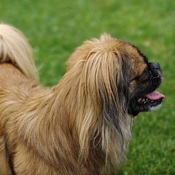 Er ist sehr sozial mit anderen Hunden und bleibt in Gesellschaft anderer Hunde gut allein. Auch alleine im Haus reagiert er ruhig, meldet jedoch Geräusche draußen mit kurzem Bellen. Dabei beruhigt er sich rasch wieder.