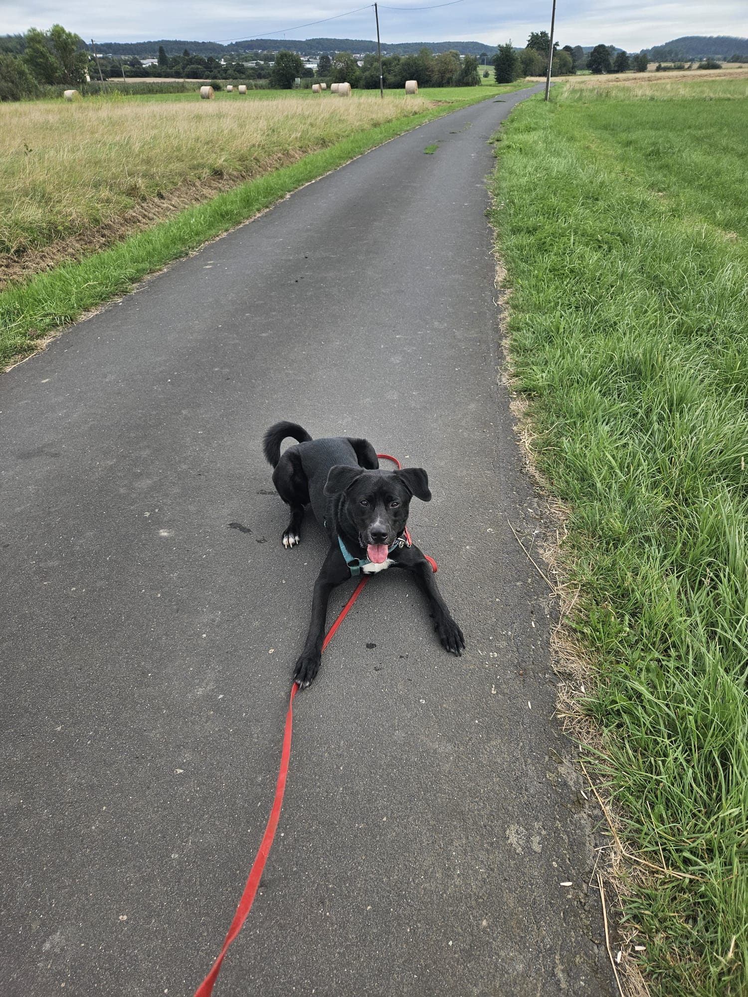 Rocky läuft mit einer souveränen Führung gut an der Leine, er hat keinen Jagdtrieb und zeigt sich draußen orientiert an seinem Menschen.
