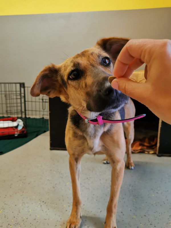Zu Menschen fasst die hübsche Hündin in kleinen Schritten vertrauen, was dabei super hilft ist Futter, denn Stella ist ziemlich verfressen. Stella kennt inzwischen ihre Hundebegleiter und steht Schwanz wedelnd an der Tür. Auch ihren Namen hat die hübsche Maus gut verarbeitet und weiß genau wer „Stella“ ist und wann man etwas von ihr möchte.