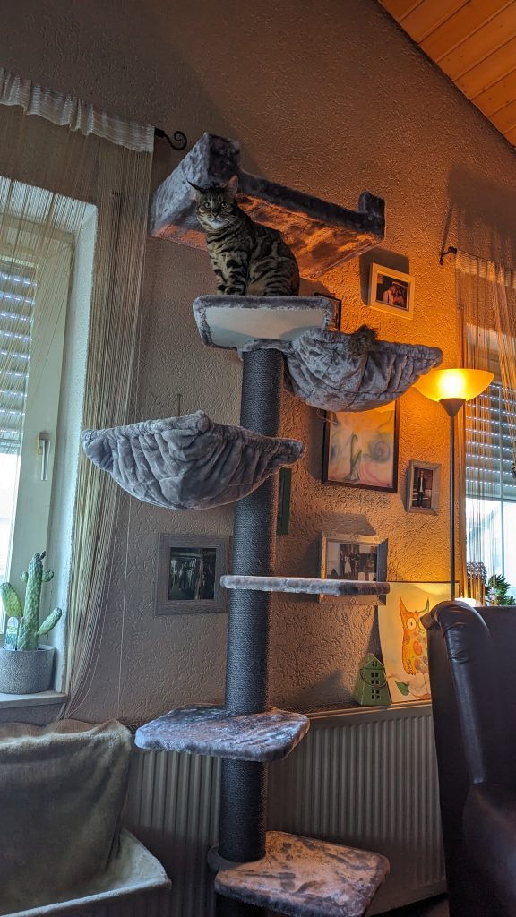 Wir spielen viel und mein Frauchen kümmert sich gut um mich….. meine Katzenklos sind immer gereinigt.