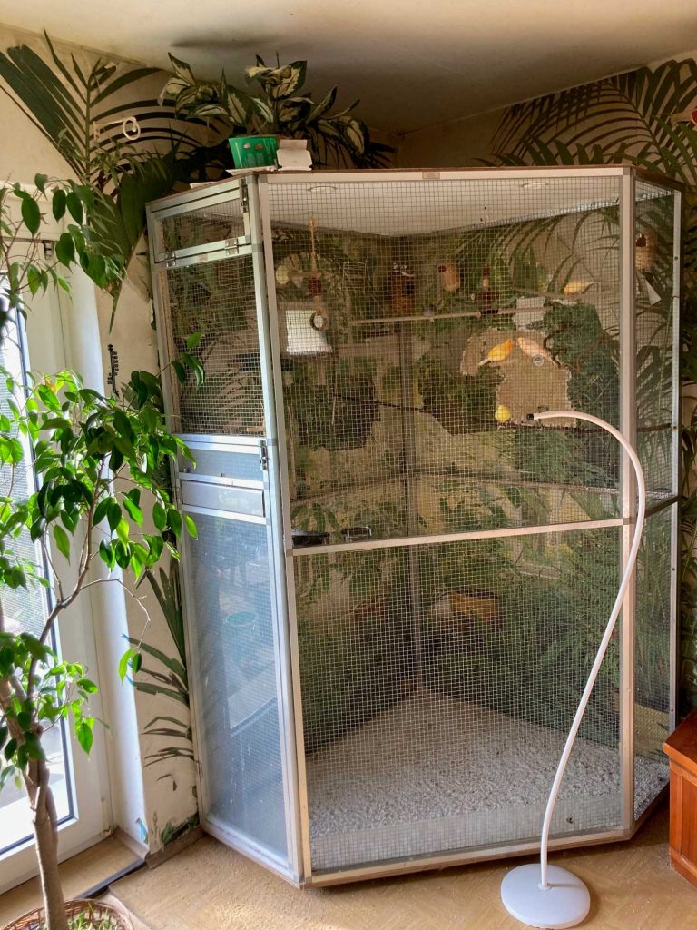 Über Nacht den Käfig an dem Ständer direkt an der Voliere hängen lassen , die Zebrafinken waren schon sehr neugierig.