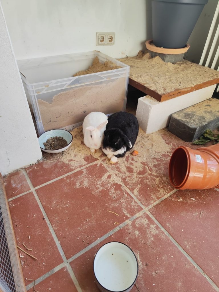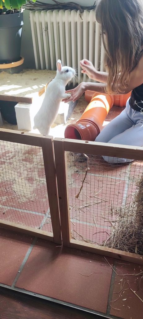 Am ersten Tag war Bunny noch sehr scheu und Puffel und sie haben sich beschnuppert. Auch später im Gehege lief alles reibungslos und sie sind sich erstmal aus dem Weg gegangen. Am nächsten Morgen lagen beide nebeneinander. Bunny ist hier sehr neugierig, aber auch scheu. Sie nimmt Essen aus unserer Hand, beschnuppert uns und lässt sich auch manchmal ganz kurz berühren. Mit unserer Tochter ist sie am vertrautesten und ist sehr bereit für ein Leckerchen einen kleinen Trick zu machen (siehe Foto)