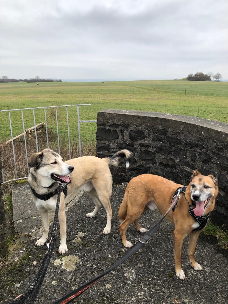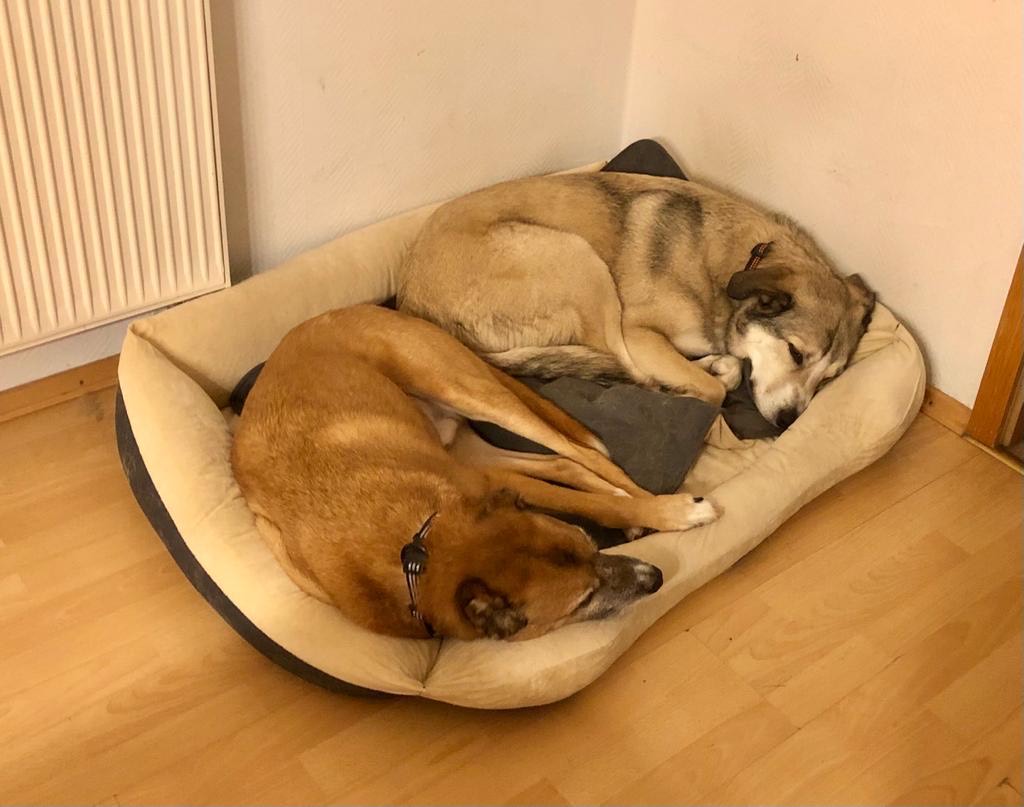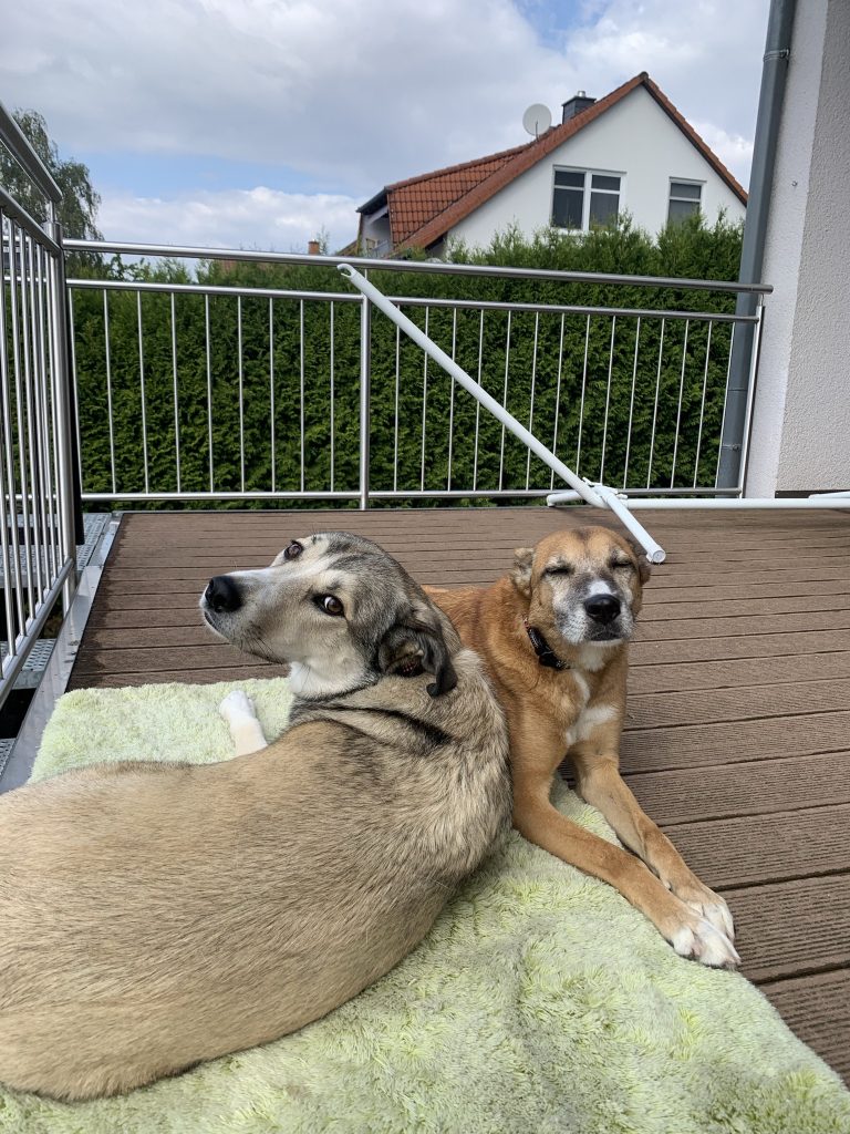 Von Anfang an war uns klar, dass Chip niemals komplett ohne seine Ängste leben wird, aber bei uns macht er Schritt für Schritt immer größere Fortschritte. Mit dem Vertrauen zu mir als sein Frauchen und zu seinem Hundefreund Leo, wächst er immer öfter über seine Ängste hinaus. Die Beiden sind wirklich toll miteinander und liegen immer und überall zusammen. Bei Spaziergängen orientiert Chip sich sehr an Leo aber ist zugleich abrufbar, nur Fahrradfahrer findet er immer noch sehr beängstigend, woran wir aber arbeiten. Besonders beim Spazieren merkt man ihm sein Alter nicht an, da blüht er regelrecht auf und fordert Leo sogar zum Spielen auf. Sein Lieblingsplatz ist auf dem Balkon, wo er stundenlang in der Sonne liegen könnte. Auch sind Autofahren und fremder Besucher mittlerweile kein großes Problem mehr.