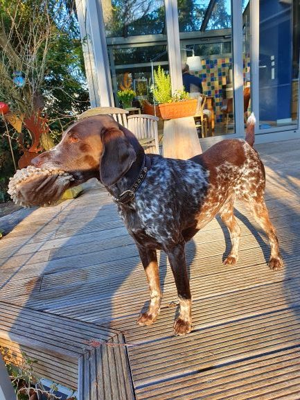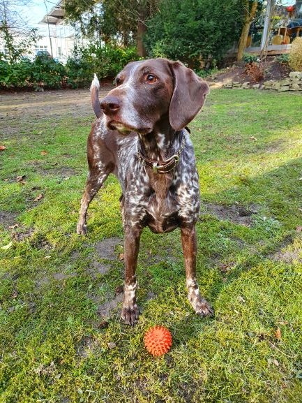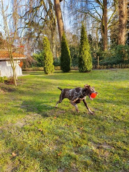 Diva genießt es, draußen zu sein, mit der Schleppleine im Feld oder im Garten, den sie heiß und innig liebt. Sie ist beweglich und schnell geworden, tobt herum und legt ab und zu ihren „Turbo“ ein und kriegt sich gar nicht wieder ein. Es ist schön zu sehen, wie viel Lebensfreude der Hund hat. Sie spielt mit ihrem Ball und ihrem Stoffigel, auch ohne Aufforderung, das sieht lustig aus.