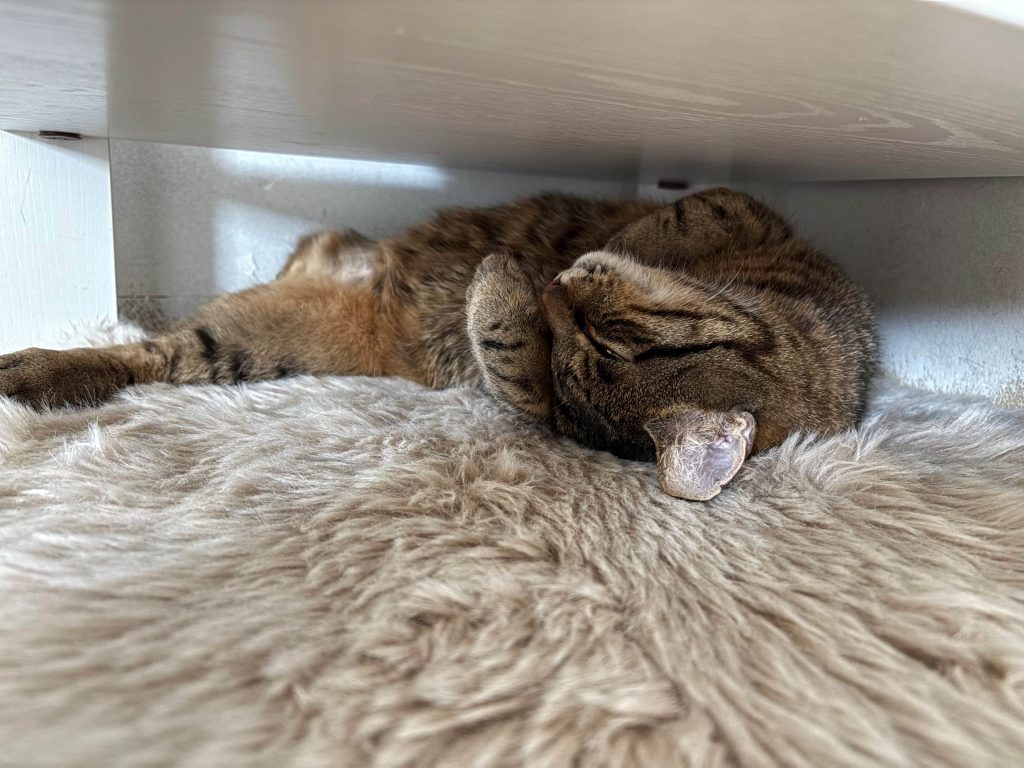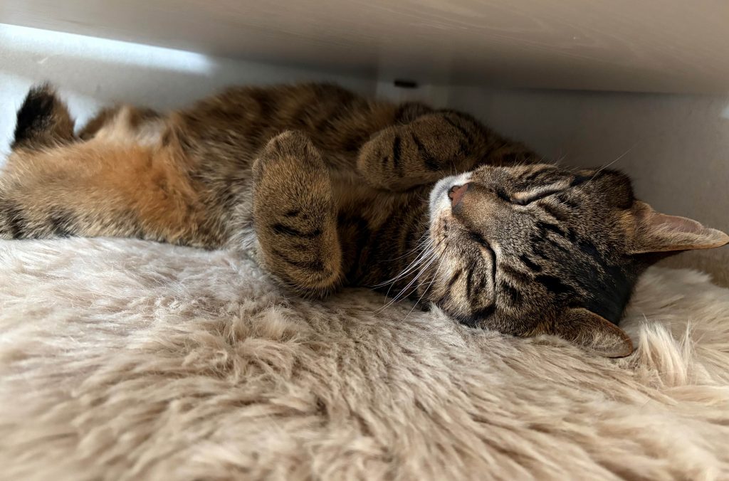 Falco (er heißt nun Leo (Löwe = Kämpfer)) ist nun seit zwei Tagen bei uns. Seit Freitagabend lässt er sich von mir schon anfassen und genießt seitdem jede Streicheleinheit. Seit gestern kommt er während meiner Anwesenheit auch aus seinem Versteckt und frisst und trinkt ganz fleißig. Beim Kuscheln schläft er gerne ganz entspannt auf dem Rücken, mit dem Kopf auf meiner Hand, ein.