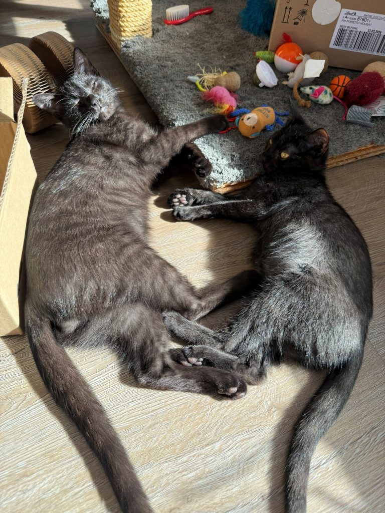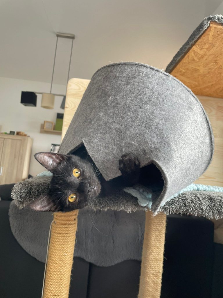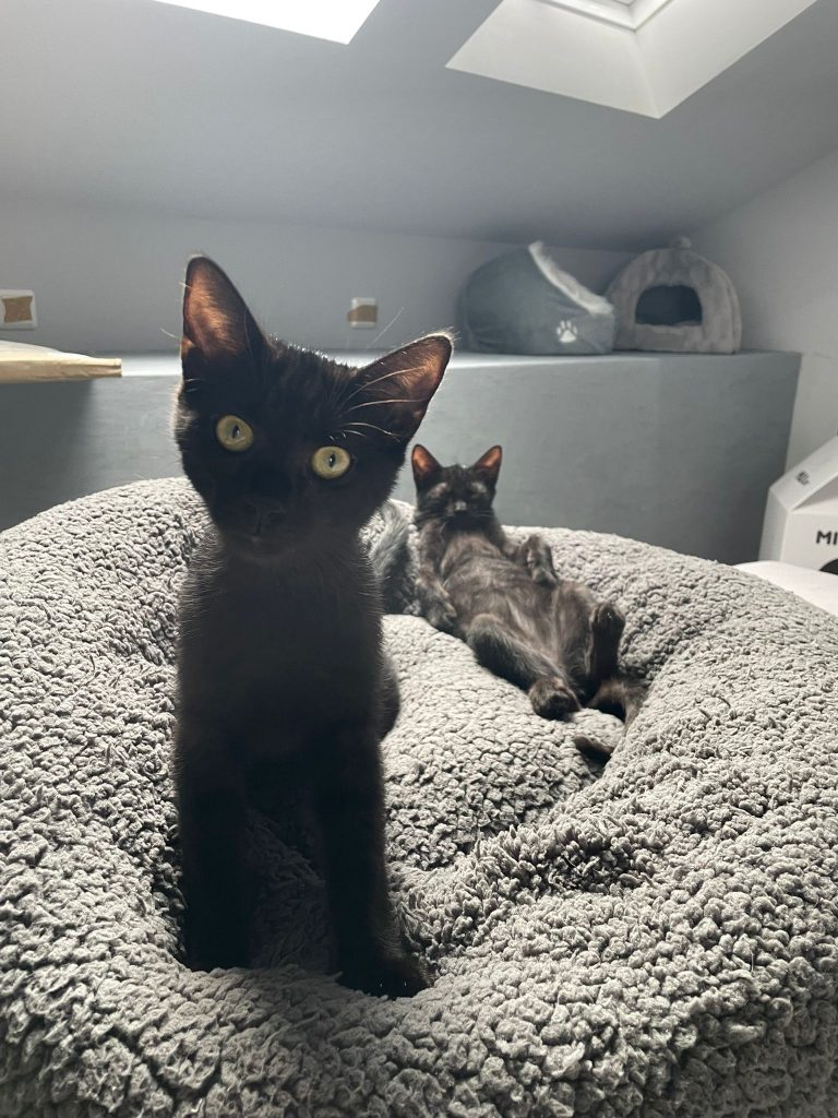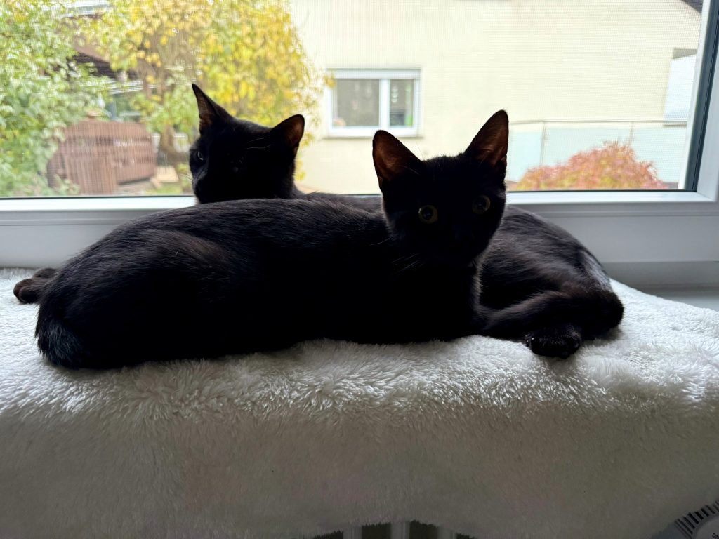 wir, Elli & Nino, sind gut in unserem neuen Zuhause angekommen. Die ersten zwei Tage waren wir noch sehr vorsichtig und mussten erstmal schauen, wo und bei wem wir hier gelandet sind. Schnell haben wir aber gemerkt, dass unsere Familie sehr lieb ist und wir keine Angst haben brauchen. Wir haben dann auch den Hund im Haus kennengelernt und der ist wirklich in Ordnung. Sie lässt uns in Ruhe und wir sie eigentlich auch. Manchmal spielen wir bei ihr im Zimmer und stören sie beim Schlafen, dann bellt sie und meckert und wir gehen lieber wieder. Einen Besuchshund kennen wir auch schon und mit dem kuscheln wir auch manchmal. Unser Alltag besteht zum größten Teil aus Spielen und Toben, zwischendurch kuscheln und manchmal schlafen wir auch. Das ist aber nicht so unser Ding und der Hund hier schläft auch schon genug. Sonst wäre unserer Familie ja auch wirklich langweilig. Wir schauen auch sehr gerne aus dem Fenster und beobachten die Vögel, Nachbarn und die Müllabfuhr. Außerdem beschäftigen wir uns gerne mit Deko, das mag Mama aber irgendwie nicht. Ninos Element ist übrigens Wasser. Er liebt es mit den Pfoten im Wasser zu spielen und zu graben. Wir sind beide negativ auf FIV getestet worden und Nino ist auch schon kastriert. Ich war noch zu klein und bin dann im November dran. Das Futter hier schmeckt sehr gut und wir wiegen mittlerweile 3,4kg und 2,5kg. Wir wachsen und gedeihen also gut und wir könnten uns kein besseres Zuhause vorstellen. Wir danken euch von Herzen, dass ihr uns beim Start ins Leben geholfen und diese Familie für uns ausgesucht habt!