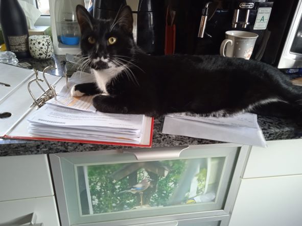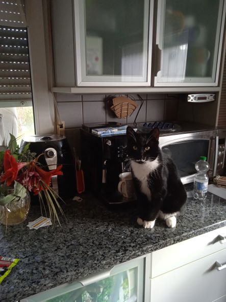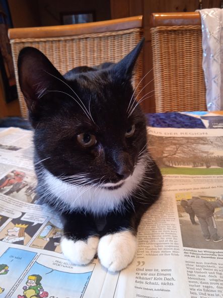 Pauli ist seit dem 8.1.22 mein Mitbewohner. Nach 45 Minuten Fahrzeit kamen wir hier in Frohnhausen an. Nachdem ich ihn mit Tasche gewogen hatte( stolze 6 kg) öffnete ich die Tasche,und Pauli stieg in geradezu majestätischer Ruhe aus,machte einen Rundgang durch die Küche,um sich dann über seinen Napf herzmachen um ihn mit gutem Appetit zu leeren. Danach ging er sofort auf sein Klo. Das Wohnzimmer nahm er auch unter die Lupe und legte sich auf die Kuscheldecke.
