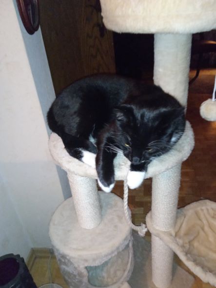 Schnell wurde es Abend und ich wartete ab, was kommt. Wie fast nicht anders zu erwarten ging Pauli mit und legte sich wie selbstverständlich neben mich. Seinen Kratzbaum habe ich mit Hantelgewichten beschwert, wenn er in vollem Lauf draufspringt, geriet er ins wanken.