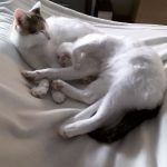 Macht euch keine Sorgen – ja, wir haben die ganze Autofahrt über geschrien! Wie konntet ihr uns das antun?? Insbesondere Franky hatte eine harte Zeit. Schlussendlich haben wir aber gesiegt und das Auto hat mitten in einer fremden Stadt anhalten müssen! Jetzt haben wir ein Zimmer in Beschlag genommen, das voll von fantastischen Erkundungsmöglichkeiten ist – nette Ecken hat, in denen wir uns verstecken können, ein Kratz- und Kletterbaum und eine super große Couch, jedenfalls ist sie groß genug für zwei Katzen. Es gibt Fenster aus denen wir rausschauen können und das Futter ist auch ok. Ein wenig blöd ist, dass der Zimmerservice nie weiß, wem unsere Fressnäpfe sind und sie machen es immer falsch!!! Die erste Nacht war o.k.