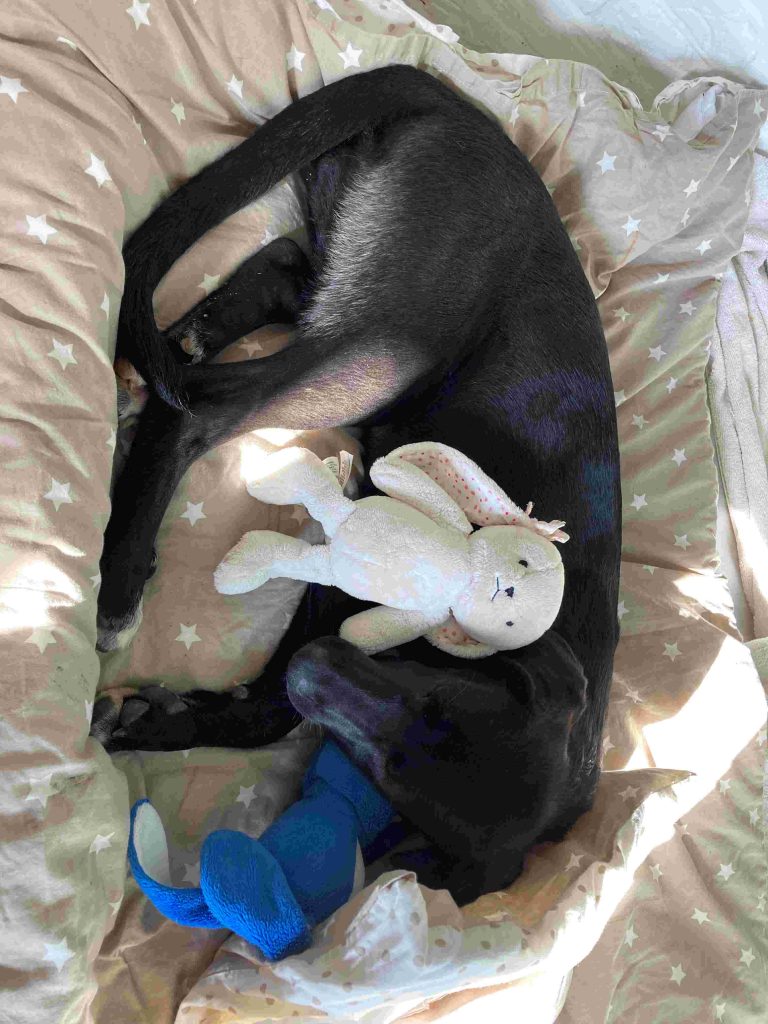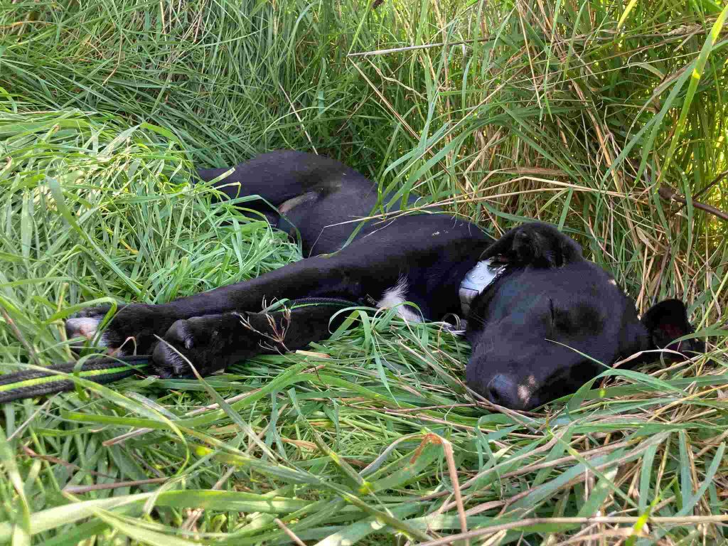 Sie entleert sich im Garten und sagt auch Bescheid, dass sie muss. Der Aufregungsdurchfall war nach zwei Tagen weg. Sie frisst super. Taut langsam auf und traut sich auch Junghundunsinn zu betreiben. Klaut Schuhe, zieht Decken von der Couch und hat den Couchtisch benagt. Wir sind gespannt, was da noch so kommt ☺️. Jetzt schläft sie gerade. Wir waren vorhin Gassi gehen, aber nach 500 Metern mag sie meist ganz schnell zum Auto zurück. Trainingseinheiten klappen im Garten ganz gut und Drinnen. Draussen gibt es noch zu viel was komisch ist. Im Garten hat sie sich schon ein paar Entspannungsstellen gesucht. Wir überlegen ihr etwas höhlenartiges zu bauen, das scheint ihr zu gefallen.