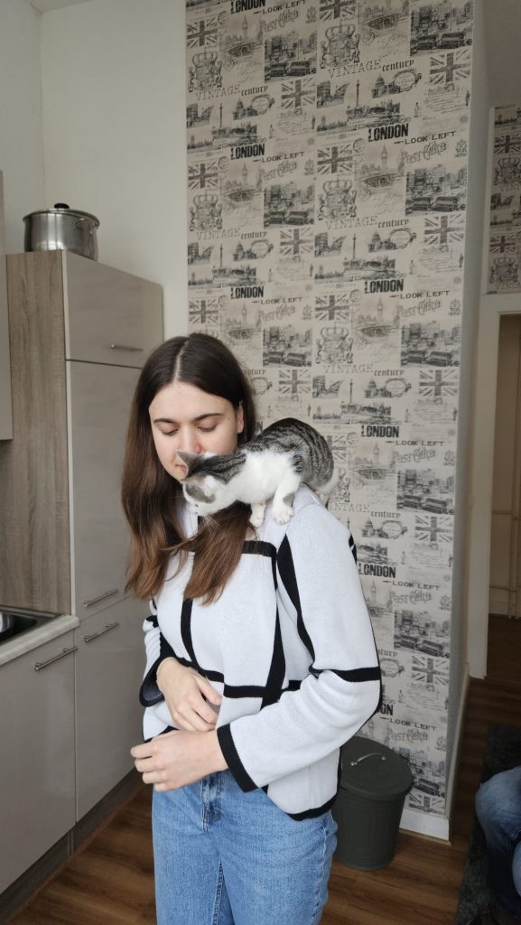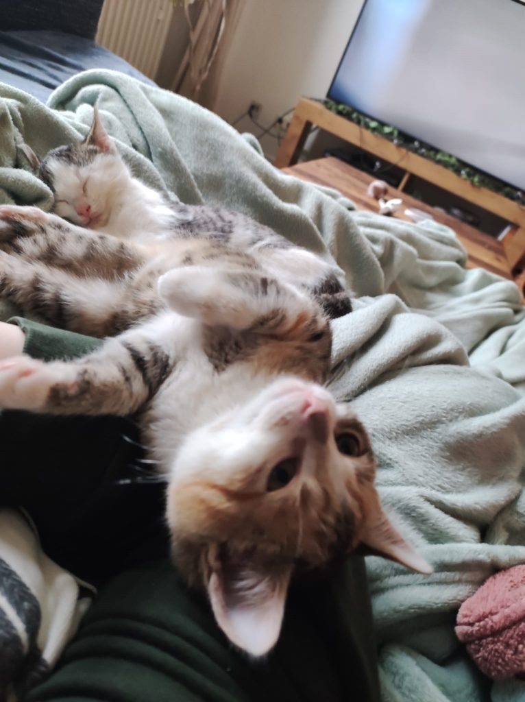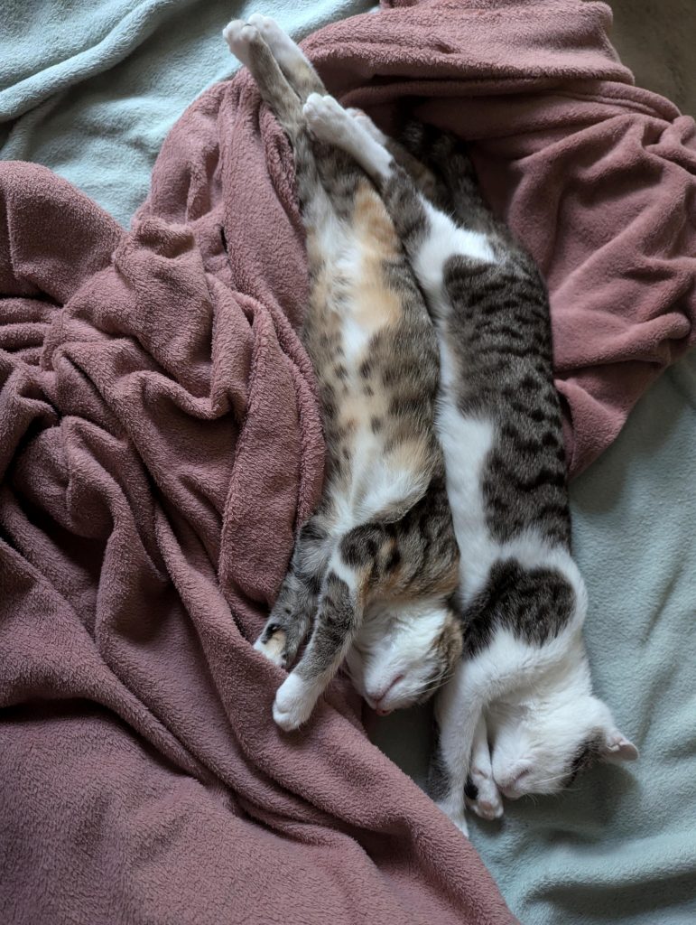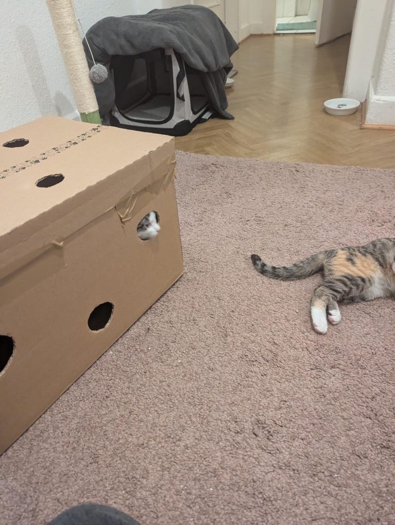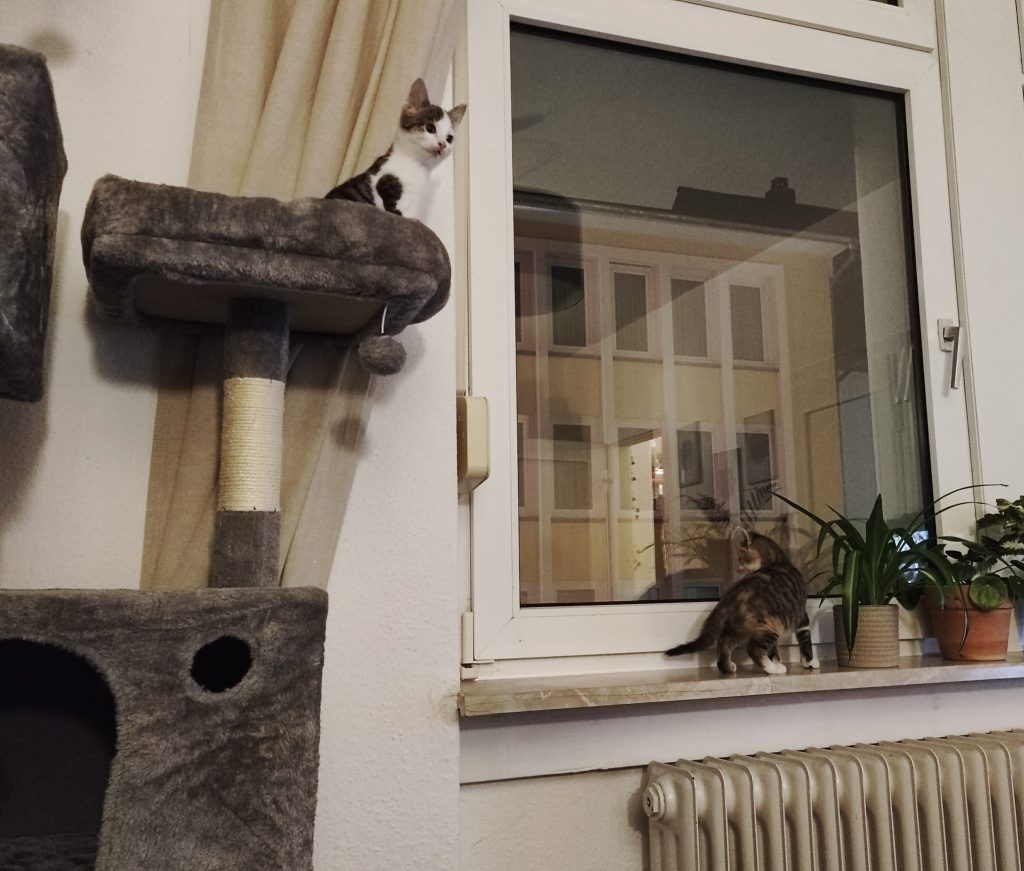 Außerdem haben wir ein paar Fotos vom ersten Monat mit uns angehängt – die beiden haben sich wirklich gut eingelebt und fühlen sich schon richtig zuhause. Wir haben die Namen geändert und sie heißen jetzt Mino und Nala.