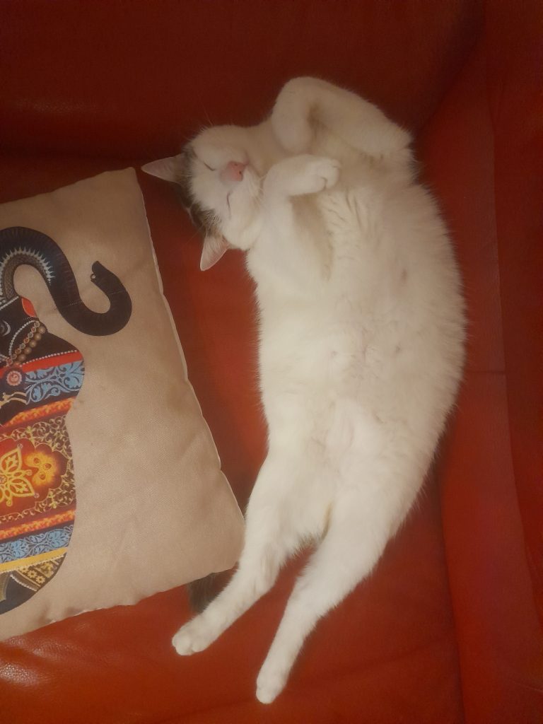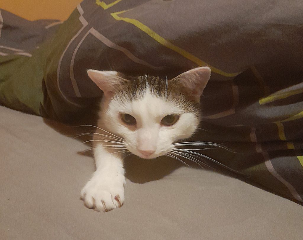 Tatsächlich wirft diese Geschichte auch ein völlig falsches Bild auf Tilda, wie wir sie erleben. Sie ist eine so niedliche und witzige Katze, noch nie war sie uns gegenüber aggressiv. Wenn ihr etwas nicht passt, guckt sie bloß empört und haut höchstens mal mit den Pfötchen nach uns, fährt dabei aber so gut wie nie die Krallen aus. Sie ist eine Meisterin lustiger Laute und liebt es, ausgiebig gekrault zu werden – hasst es jedoch, wenn man sie hochnimmt (auch hier ist sie das Gegenteil von Jimmy). Und wenn sie einmal angefangen hat (laut!) zu schnurren, hört sie so schnell nicht wieder damit auf. Sie hat einige liebenswerte (teils auch ziemlich skurrile) Schrullen und Macken und bringt uns oft zum Lachen. Schade eigentlich, dass andere Menschen sie praktisch nie zu Gesicht kriegen. Wenn Besuch kommt, nimmt Tilda Reißaus und versteckt sich, sobald es an der Haustür klingelt.