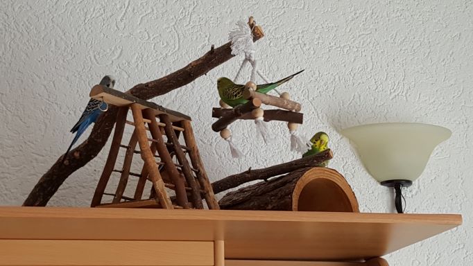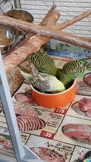 „Wir fühlen uns hier richtig wohl und haben viel Platz zum Fliegen (so groß muss Australien sein!). Allerdings hat Buffy (= klein und grün) noch Probleme wegen der abgebrochenen Schwung- und Schwanzfedern.