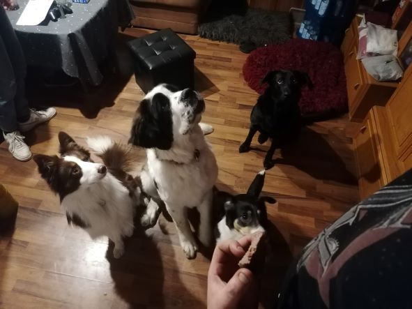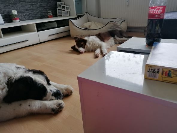Zuhause ist er nicht mehr ganz so gierig auf Futter und hat gelernt wem welcher Napf gehört, schläft durch und macht nichts kaputt.