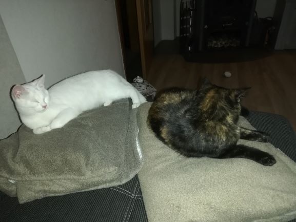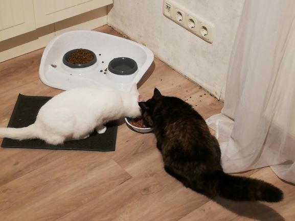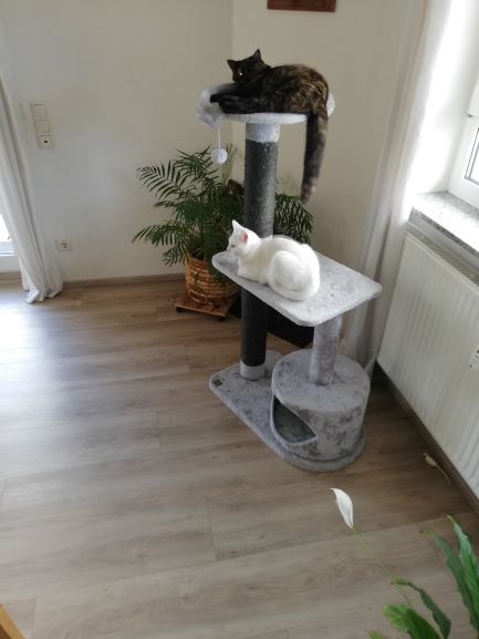 Die beiden haben am Freitag schon aus einem Napf gefressen, danach haben sie zusammen gespielt und schlafen jetzt zusammen im Korb, auf dem Kratzbaum oder wo es halt gerade passt.