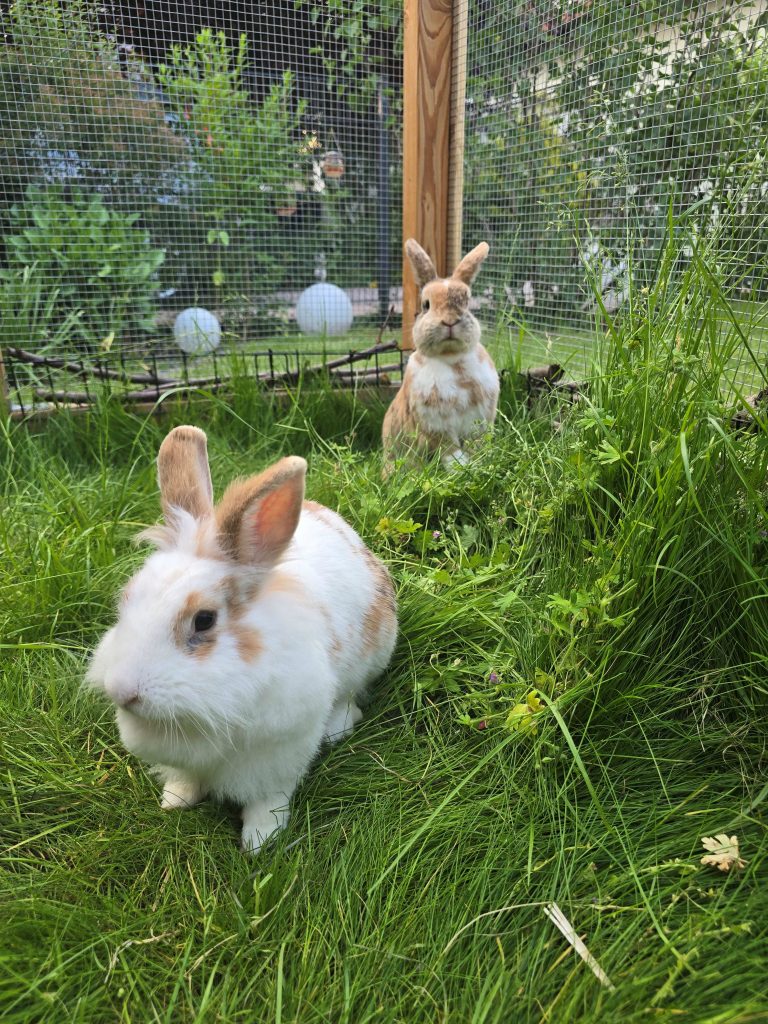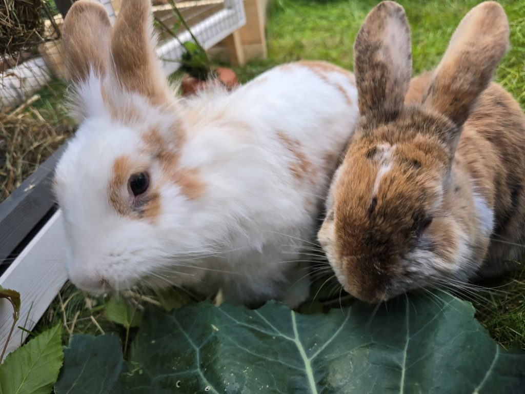 Lila und Blue (bei uns als Anabell und Hoppel benannt) grüßen ganz lieb aus ihrem neuen Zuhause. Bis auf einen Schnupfen bei Anabell haben sie sich gut eingelebt und freuen sich viel Platz zum spielen und toben zu haben. Sie sind super zutraulich und freuen sich immer über frisches Grün aus dem Garten (besonders Kohlblätter, Kirschbaumblätter und frische Hainbuchenzweige). Kräuter gehen natürlich auch immer 😀