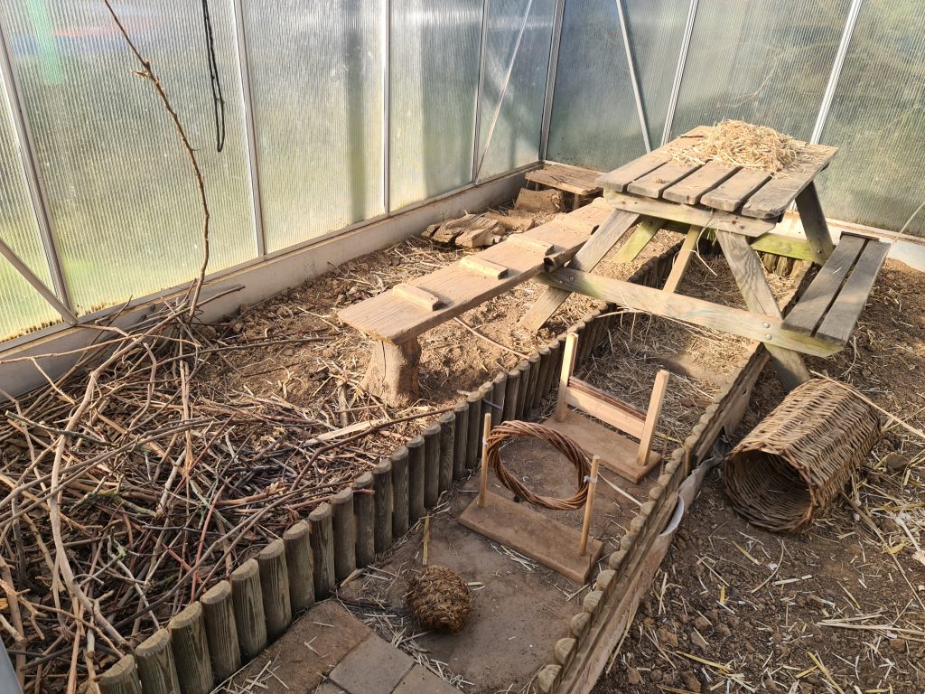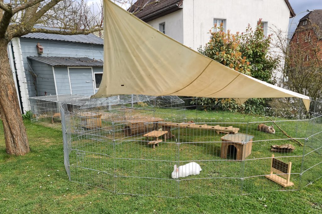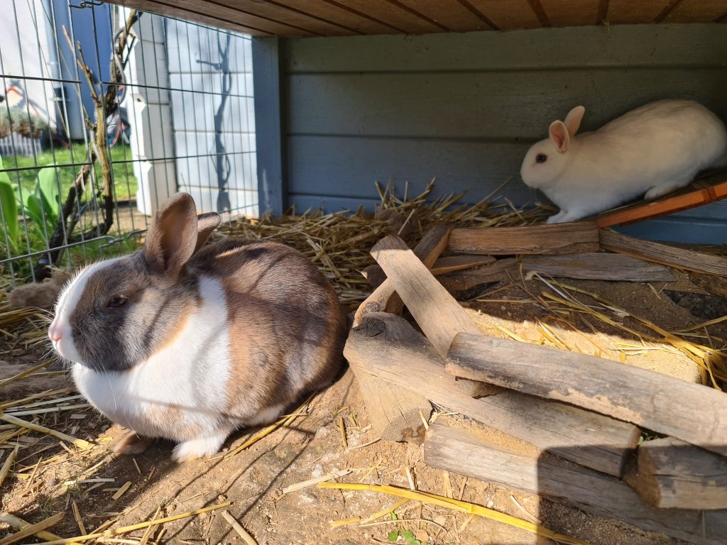 wir sind’s, Lilou und Lovis oder jetzt Mila und Schnackel genannt, Eure Ex-Kaninchenhaus-Bewohner. Eigentlich wollten wir uns schon längst mal melden, aber hier ist immer so viel zu tun; Rasenmähen, Holz zerkleinern, Löcher buddeln, Stall umdekorieren, uns gegenseitig putzen, Gewächshaus umgraben und düngen sowie vorallem unsere Menschenfamilie bespaßen. Jetzt wohnen wir bereit seit 8 Monaten hier n Laubach und haben uns prima eingelebt. Auch den Winter haben wir problemlos in unserem Außengehege überstanden. Minusgrade bis -8°C ließen uns nicht erzittern. Selbst beim schlechten Wetter konten wir im Gewächshaus unsere Sprünge üben und mit den Menschenkindern spielen. Wir sind immernoch sehr verschmust und zutraulich. Endlich ist es Frühling und das frische Gras spriesst wieder, sodas unser Freigehege wieder auf die Rasenfläche verlegt wurde.
