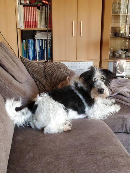 Alles läuft ganz wunderbar mit ihm, und er scheint auch sehr zufrieden zu sein. Wir hätten nicht erwartet, dass er so schnell zutraulich wird. Am zweiten Abend hat er sich schon auf dem Sofa genüsslich den Bauch kraulen lassen. Er kann auch sehr gut alleine bleiben. Die Zeit, bis ich mittags heim komme, verschläft er seelenruhig auf dem Sofa oder in seinem Körbchen.