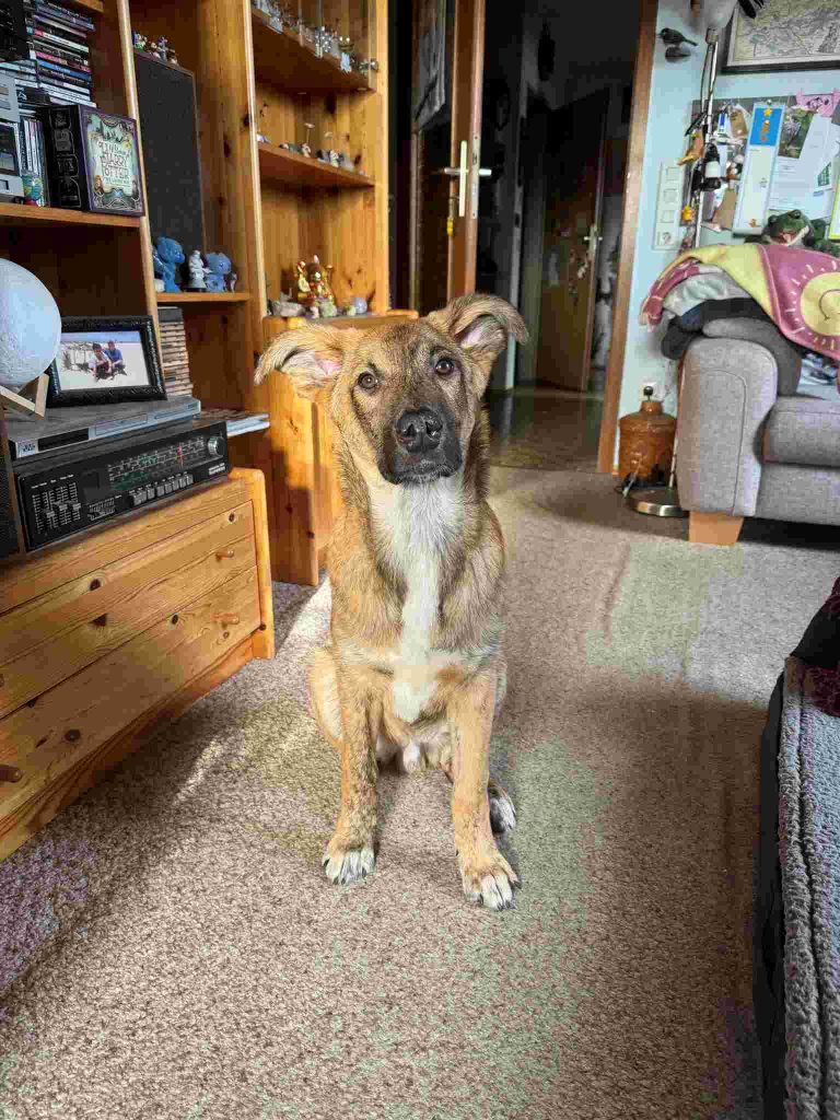 Milou lebt jetzt seit etwas mehr als einen Monat bei uns und hat sich schon sehr gut eingelebt. Am Anfang war er draußen noch etwas ängstlich und unsicher, aber mittlerweile erkundet er gerne Wald, Feld und Wiese. Da gibt es nämlich so viele neue Gerüche und Dinge zu entdecken. Außer wenn es regnet, da ist er ne kleine Diva. Er liebt Menschen und jeder ist von ihm begeistert. In der ersten Woche war er mit bei einer Familienfeier mit Kindern und hat das super gemeistert. Bei den Hunden aus dem Dorf taut er auch immer mehr auf und hat schon zwei Spielkameradinnen.