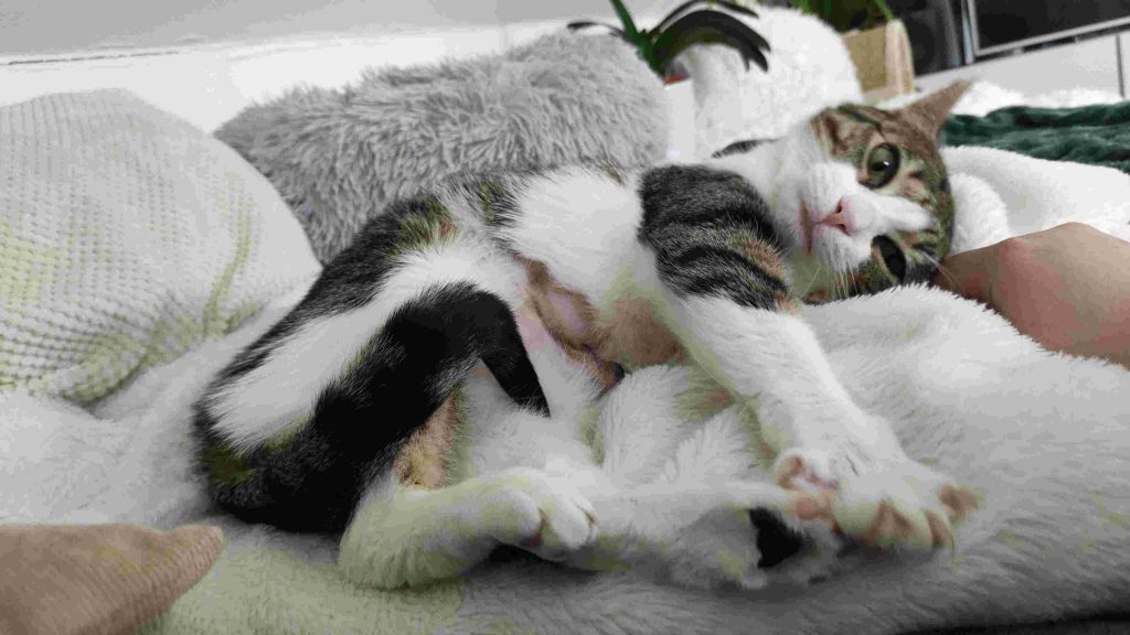 Mina frisst mittlerweile besser, sie ist nur noch leicht angespannt. Tag für Tag wird es weniger, dafür verteilt Sie ihr essen meilenweit. Sie lernt gerade frisch gekochtes kennen & genießt es sehr. Der Trinkbrunnen macht ihr am meisten Spaß. Sie spielt sehr viel & auch ihr Fellmittbewohner scheint sie zu akzeptieren. Freunde sind sie noch nicht, sie testen noch aus wer der dominante part und wer der größere Schisser ist 😉 solange ich in der Mitte liege und beide graule, liegen sie auch gemeinsam. Sonst eher auf etwas Abstand, wobei auch schon häufiger die Distanz sich verringert. Theoretisch könnten sie auch verschiedene Räumlichkeiten und diverse Plätze nutzen, tun Sie nur nicht. Bisher gibt es hier und da ein Fauchen & 2x ein Schreien ( Mina ist ja so eine Drama Queen wow!! Mickey war damals nur in ihrer Nähe & stellte den Kamm, dabei wirft sich die Dame auf den Rücken und tut als haut er nach ihr…) Eifersucht ist also noch ein Thema, legt sich aber. Mina versteht langsam das ihr weder Sofa, noch Bett, noch die graulende Hand „allein“ gehören. Geleckt hat sie sich hier nur zur Fellpflege.