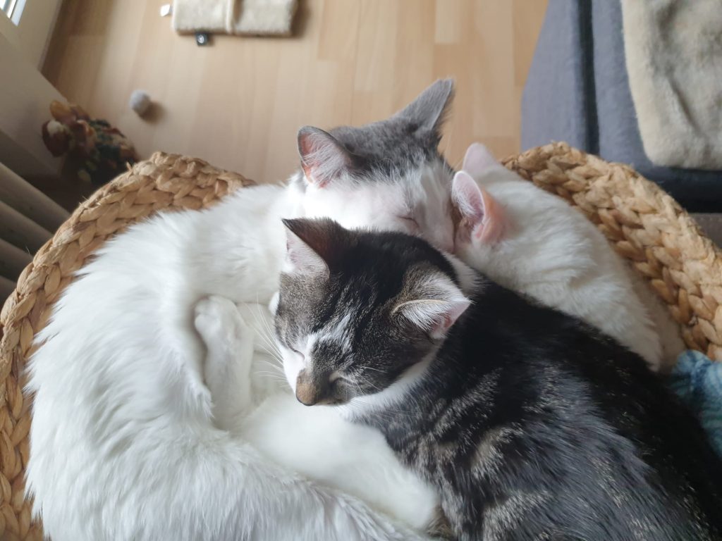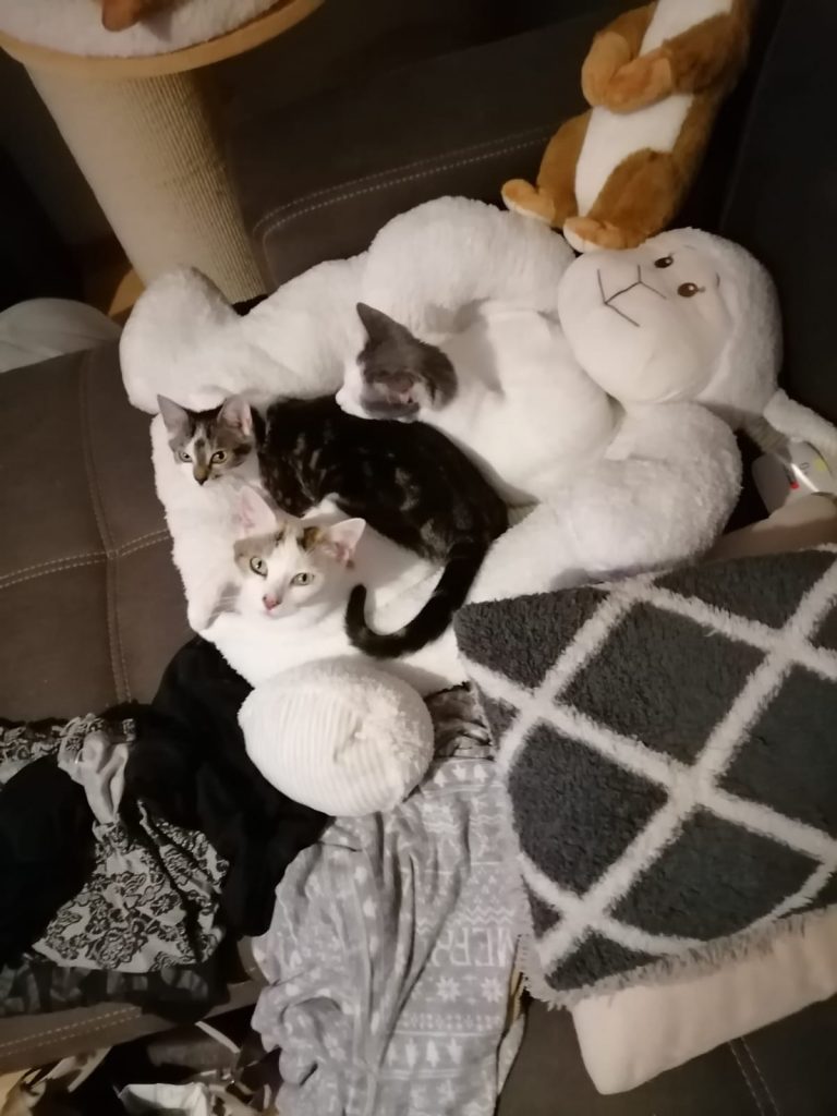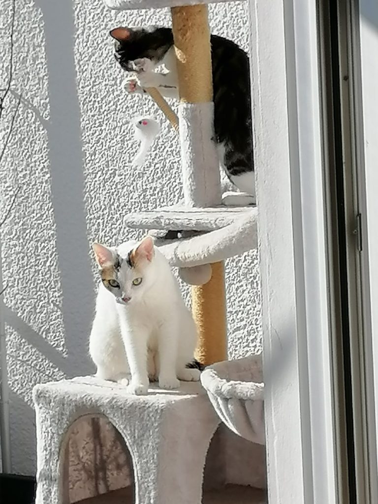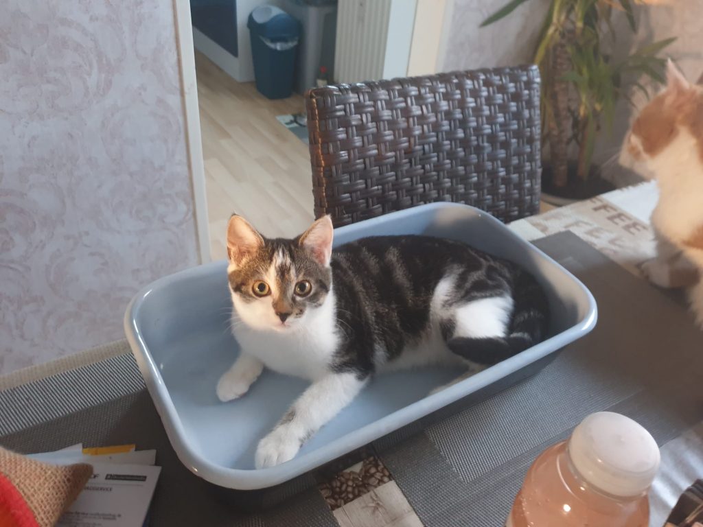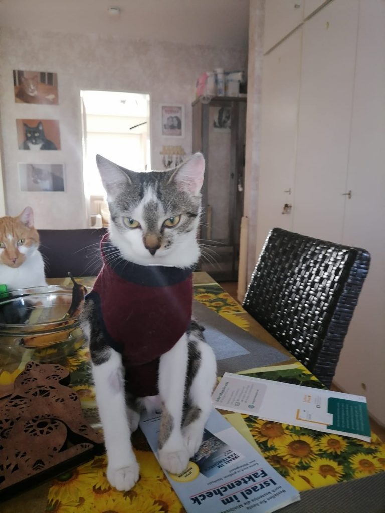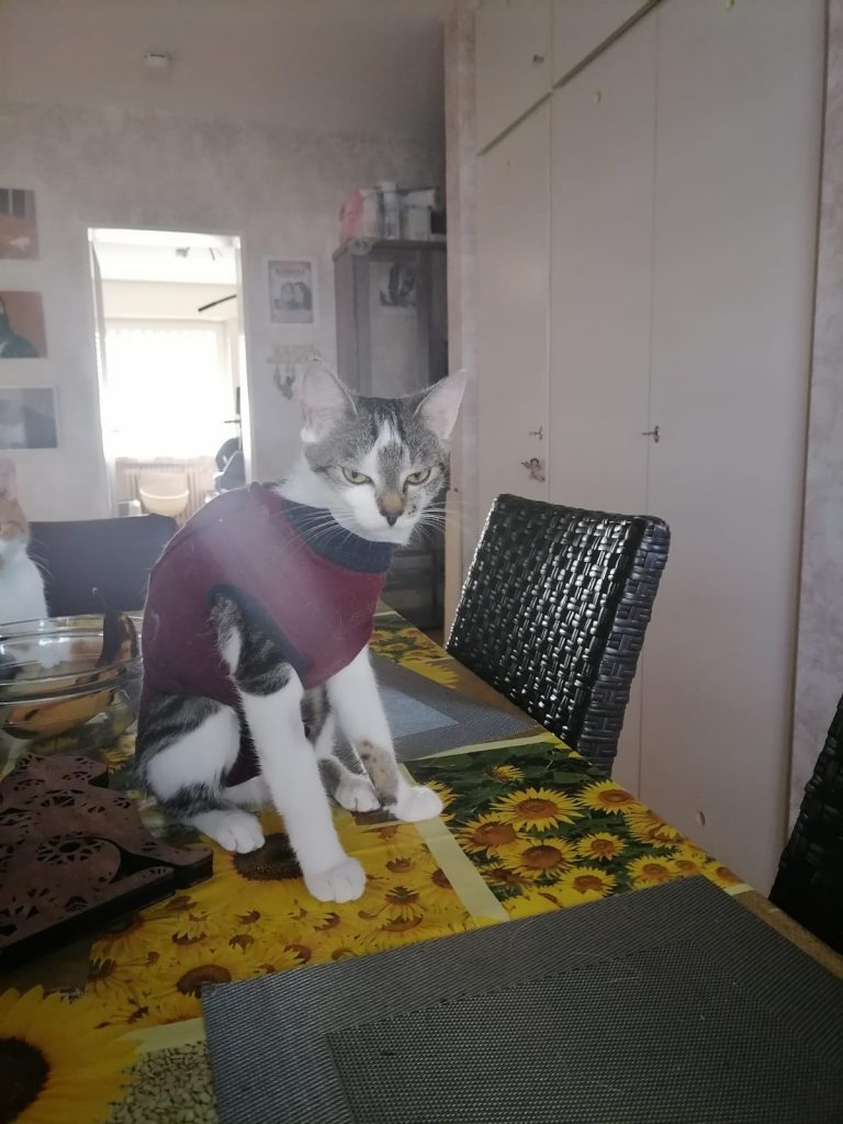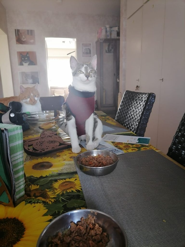 Ich wollte mal wieder berichten wie gut sich die kleine Muiri eingelebt hat. Da sie dann zwei mal kurz Rollig war, haben wir sie jetzt am Dienstag zur Kastration gebracht Und zum Glück hat sie alles gut überstanden und maschiert hier wieder ganz normal rum, nur Ihr Body stört sie beim putzen, aber was muss das muss, besser wie wenn sie an der naht rum knappert und sich was enzündet. Da ich ja 100€ Kaution dafür bezahlt habe sie kastrieren zu lassen, habe ich mich dafür entschieden Das Geld an euch zu spenden, denke ihr könnt das gut gebrauchen. Ein paar Bilder von Muiri und ihren Freunden, sowie die Rechnung der Kastration habe ich angehängt. Hoffe ihr freut euch das ihr eine kleine Seele so gut vermittelt habt, denn wir geben sie nie wieder her😍🥰♥️ Sie ist ein echter Sonnenschein, sie liebt den vernetzten Balkon und tobt jeden Morgen mit ihrer Freundin Farima über stock und stein, kratzbaum hoch quer durch die ganze Wohnung und zurück. Es echt schön wie gut sich alle vier verstehen und wir beobachten sie gern dabei, auch wird hier viel geschmust, alles in allem es ist das perfekte Rudel🍀♥️
