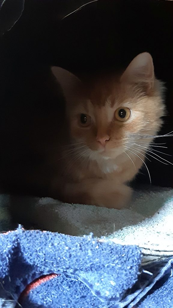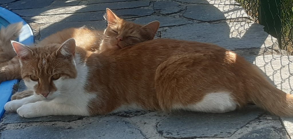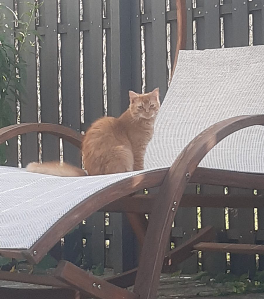 nun bin ich seit knapp zwei Monaten in meinem neuen Zuhause und möchte euch gerne ein paar Einblicke in meinen Alltag geben. Seit dem 12.08. kann ich durch eine Katzenklappe nach draußen. Die Funktion der Katzenklappe habe ich schnell durchschaut, sodass das Durchgehen in beide Richtungen kein Problem für mich ist. Den Garten fand ich zuerst sehr gruselig. Ihr wisst ja, dass ich eher scheu bin und mir vor allem neue Situationen etwas Angst machen. Die ersten Tage habe ich mich im Holz, oder unter Büschen versteckt, so konnte ich alles beobachten, wurde aber selbst fast nicht gesehen. Wenn mein Freund Smirre (der Freigänger Kater, der hier schon länger wohnt) von seinem Streifzug zurück kam, rannte ich aus meinem Versteck zu ihm. Er gibt mir viel Sicherheit. In seinem Beisein traue ich mich ziemlich nah an die Menschen und lasse mich auch manchmal streicheln. Ab und zu schnurre ich dabei auch ganz leise, denn so eine kraulende Hand ist schon etwas schönes. Wenn ich den Menschen den Rücken zu drehe, halte ich das Streicheln auch ein bisschen aus, drehe ich mich um und sehe, dass die kraulende Hand zu einem Menschen gehört, renne ich ein paar Meter weg. Vielleicht kann ich meine Angst ja irgendwann überwinden und werde ein verkuschelter Couchpotato 😽. Bei Smirre ist das mit der Nähe ganz anders. Bei ihm bin ich kein bisschen schüchtern. Wir mögen uns von Anfang an sehr und ich kuschel sooo gerne mit ihm. In den letzten Tagen traue ich mich, im Garten, auf der Nachbarwiese und im nähren Umkreis ums Haus herum spazieren zu gehen, wild mit Smirre zu toben und auch einmal ganz ohne Versteck in der Sonne zu relaxen. Wenn ich gerufen werde, komme ich ziemlich schnell nach Hause, halte aber etwas Sicherheitsabstand zu der Person, die mich ruft, ein zartes „Miau“ reicht erst einmal zur Begrüßung 😉. Anbei ein paar Fotos von mir.