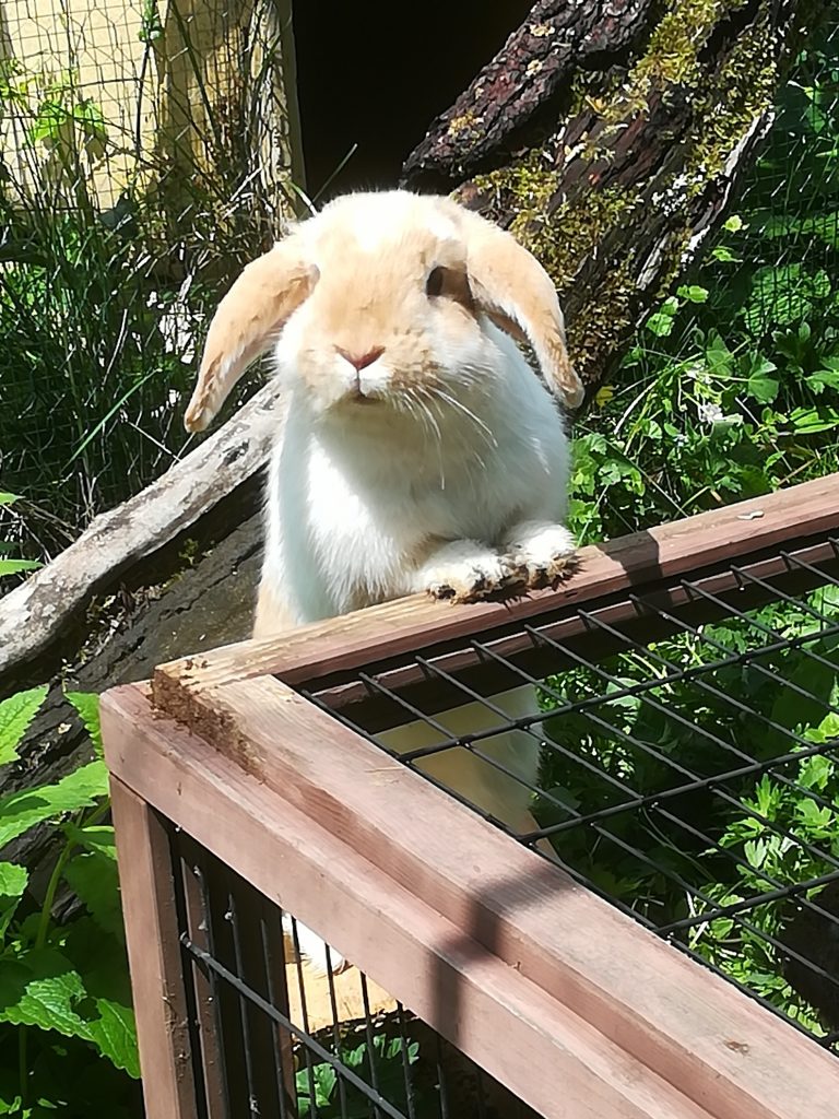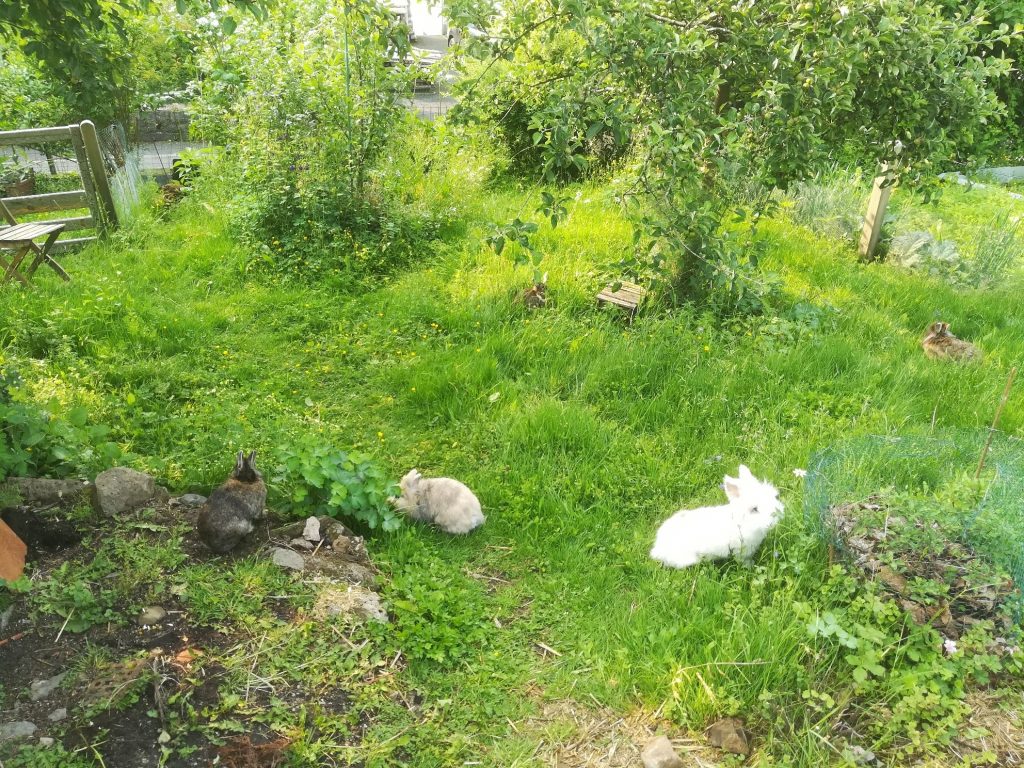 Ich freue mich täglich über meine Kabinchenbande und möchte keines davon missen. Die Zusammenführung in neutraler Umgebung ist abgeschlossen. Nachdem alle kuschelnd zusammen gesessen haben, sind sie wieder in den Kaninchen Bereich meines Gartens gekommen und seit gestern dürfen sie in das große Freigehege.
