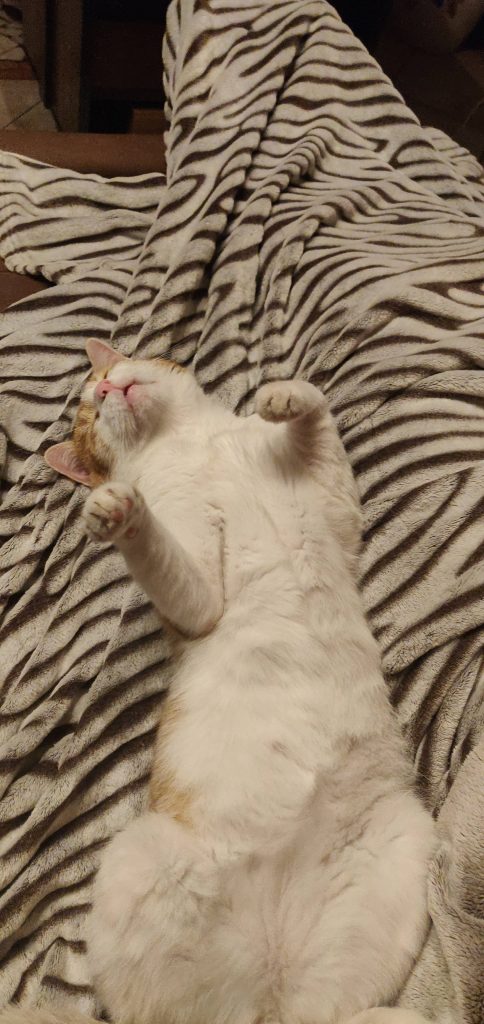 Er hat innerhalb von einem Tag unserer Katze, die ihn dauernd anfauchte, durch maunzen und Gestiegen klar gemacht ich will doch nur spielen. 😄🥳 Er ist unheimlich zutraulich, lässt sich ohne Probleme überall anfassen, selbst im Schlaf.