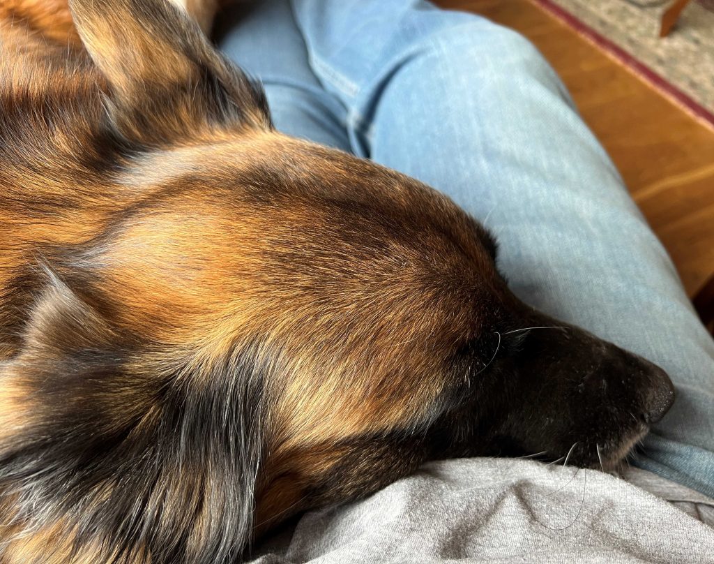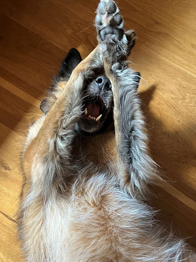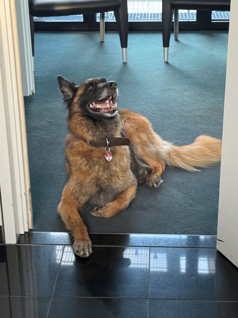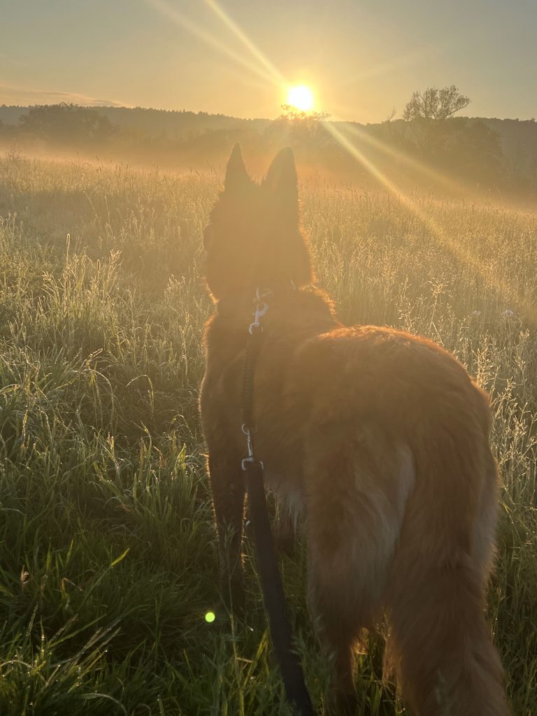 Wir haben den Eindruck, dass Ronja schon sehr viel Stress in ihrem Leben hatte und ihre Vorstellung von einem perfekten Tag ist, dass wir beide den ganzen Tag hier sind, niemand uns besucht, wir zwischendurch mal auf dem Hof eine Trainings-Einheit machen, es einen schönen Kauknochen gibt und wir ein paar entspannte Spaziergänge zur gewohnten Wiese gehen. Am liebsten jeden Tag das selbe und keine Aufregungen. Wir versuchen ihr das so oft es geht mittels Homeoffice zu bieten, aber ein bisschen muss sie sich halt auch auf unser Leben einstellen…