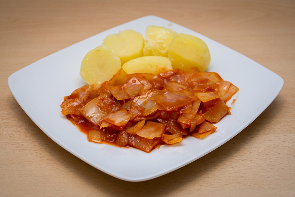 Den Kohl klein schneiden und mit der gehackten Zwiebel in Öl in einem Topf anschwitzen. Das Lorbeerblatt und die Wacholderbeeren hinzugeben und alles bei geschlossenem Deckel etwa 5 Minuten schmoren. Dann die Gemüsebrühe, das Tomatenmark und etwas Chilipulver hinzufügen. Alles im geschlossenen Topf schmoren lassen bis der Kohl weich ist. Dann mit Salz und Paprika abschmecken.