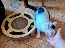 Anfangs war Stella sehr schüchtern und verängstigt und hatte sich immer in ihrem Körbchen oder dem Kratzbrett-Häuschen versteckt. Wir haben sie dann mal mitsamt Körbchen oder Häuschens auf den Tisch gestellt und nur mit ihr gesprochen, damit sie unsere Stimmen kennenlernen konnte. Dann, nach 2-3 Tagen haben wir auch mal vorsichtig versucht sie ein wenig zu streicheln wenn sie im Körbchen saß und das ließ sie auch zu, aber zunächst einmal blieb sie immer in einem der Verstecke wenn wir in der Küche waren.