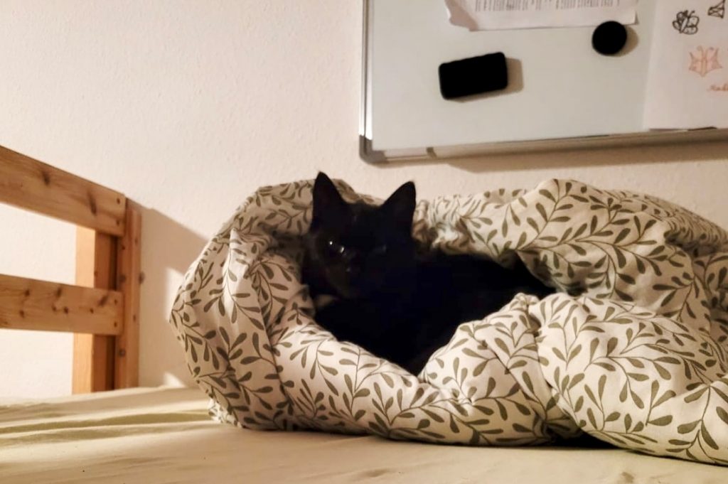 Tasha wohnt jetzt fünf Monate bei uns und ist eine fröhliche, verkuschelte Katze geworden. Auf dem Foto macht sie unserer Tochter ihr Bett streitig. Ich wünsche Ihnen ein schönes neues Jahr und danke für Ihre wichtige Arbeit.